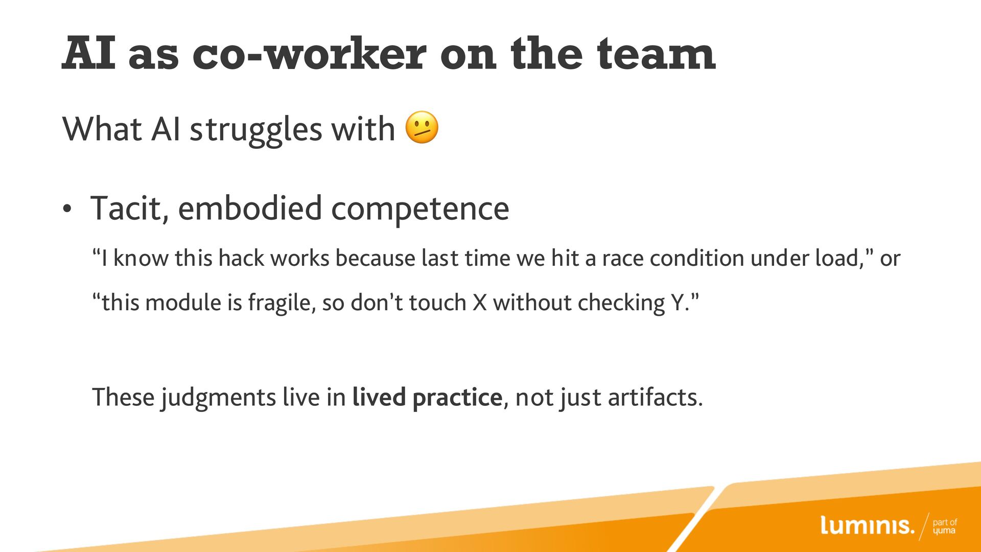 = • Tacit, embodied competence “I know this hack works because last time we hit a race condition under load,” or “this module is fragile, so don’t touch X without checking Y.” These judgments live in lived practice, not just artifacts.