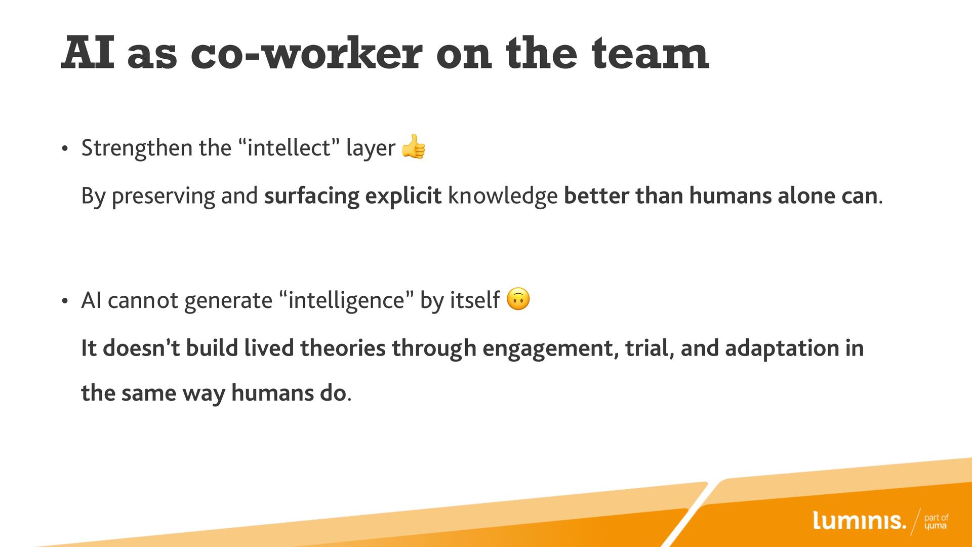 layer % By preserving and surfacing explicit knowledge better than humans alone can. • AI cannot generate “intelligence” by itself > It doesn’t build lived theories through engagement, trial, and adaptation in the same way humans do.