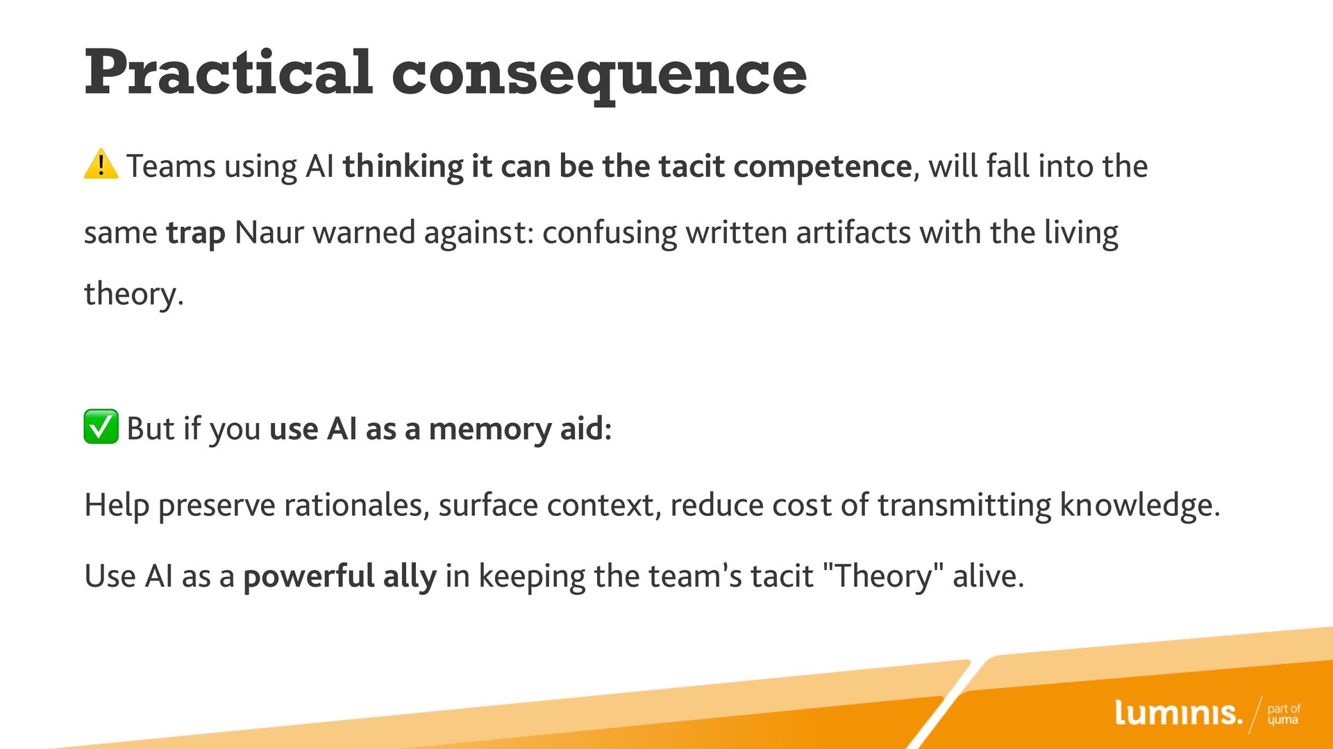 the tacit competence, will fall into the same trap Naur warned against: confusing written artifacts with the living theory. ✅ But if you use AI as a memory aid: Help preserve rationales, surface context, reduce cost of transmitting knowledge. Use AI as a powerful ally in keeping the team’s tacit "Theory" alive.