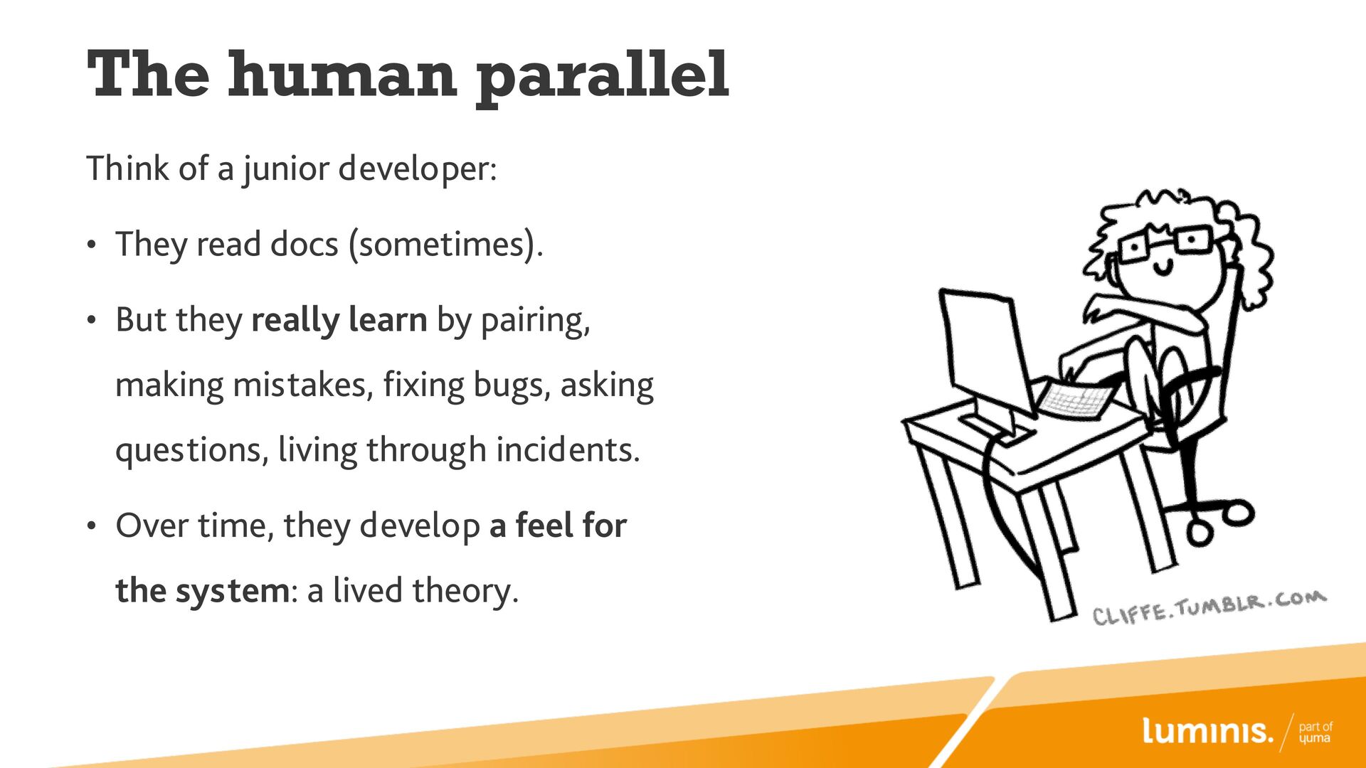 read docs (sometimes). • But they really learn by pairing, making mistakes, fixing bugs, asking questions, living through incidents. • Over time, they develop a feel for the system: a lived theory.