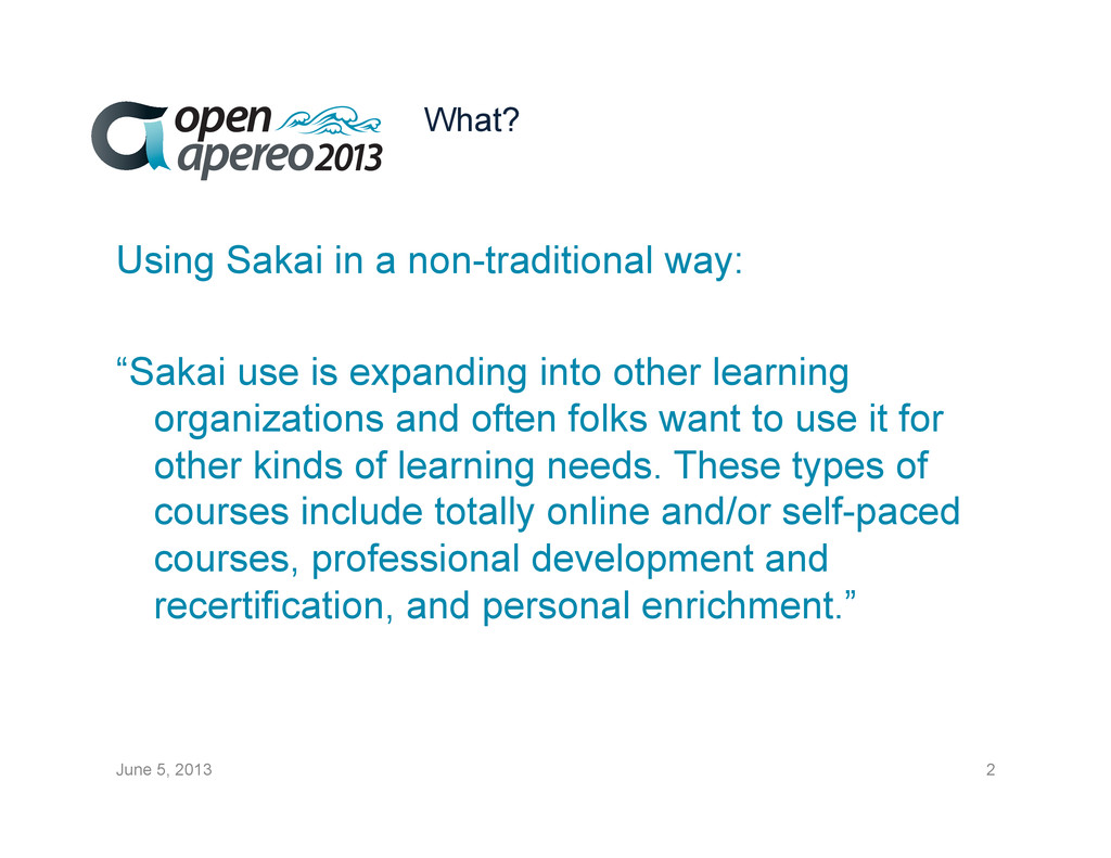 expanding into other learning organizations and often folks want to use it for other kinds of learning needs. These types of courses include totally online and/or self-paced courses, professional development and recertification, and personal enrichment.” June 5, 2013 2