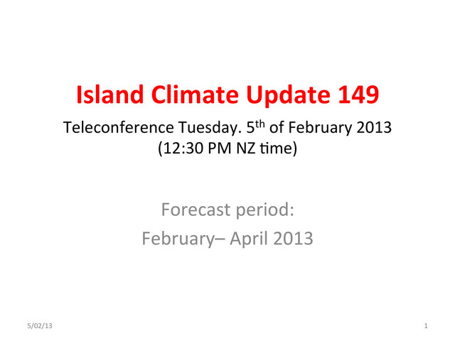 April 2013 ICU Rainfall Guidance ISLAND PROBABILITY OUTLOOK CONFIDENCE Fiji 25 35 40 AVG - ABOVE High FSM 25 35 40 AVG - ABOVE High Pitcairn Island 25 40 35 AVG - ABOVE High Tonga 25 40 35 AVG - ABOVE High Austral Islands 30 40 30 NEAR NORMAL High Cook Islands (Southern) 30 40 30 NEAR NORMAL High New Caledonia 30 40 30 NEAR NORMAL High Niue 30 40 30 NEAR NORMAL Moderate-High Papua New Guinea 30 40 30 NEAR NORMAL High Samoa 30 40 30 NEAR NORMAL High Solomon Islands 30 40 30 NEAR NORMAL High Vanuatu 30 40 30 NEAR NORMAL High Wallis & Futuna 30 40 30 NEAR NORMAL High Society Islands 35 35 30 CLIMATOLOGY Moderate-High Tuamotu Islands 35 40 25 AVG - BELOW Moderate-High Tuvalu 35 40 25 AVG - BELOW High Kiribati (Eastern) 40 35 25 AVG - BELOW High Kiribati (Western) 40 35 25 AVG - BELOW Moderate-High Tokelau 40 35 25 AVG - BELOW Moderate-High Cook Islands (Northern) 45 30 25 BELOW Moderate-High Marquesas 45 35 20 BELOW Moderate-High Rainfall outcomes estimated from an average of dynamical and statistical models for the Pacific Ocean region. The first three columns indicate the probability for rainfall occurring in