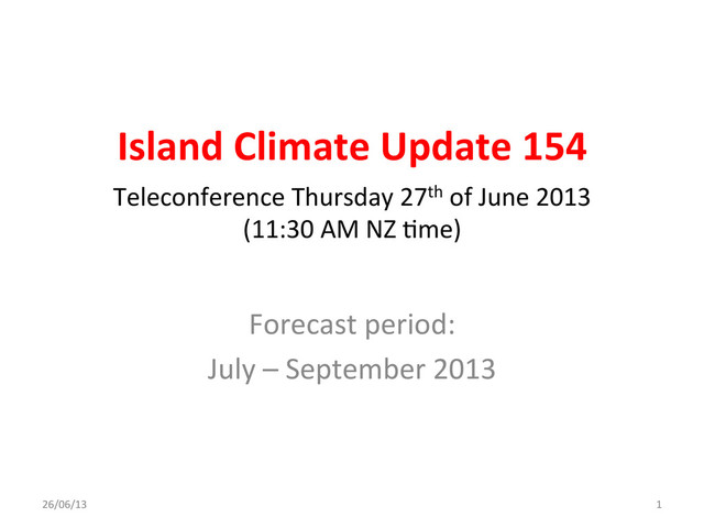 !!! July – September 2013 ICU Rainfall Guidance ISLAND PROBABILITY OUTLOOK CONFIDENCE Papua New Guinea 25 35 40 AVG - ABOVE High Niue 25 40 35 AVG - ABOVE High Samoa 25 40 35 AVG - ABOVE High Solomon Islands 25 40 35 AVG - ABOVE High Austral Islands 30 40 30 NEAR NORMAL High Cook Islands (Northern) 30 40 30 NEAR NORMAL High Cook Islands (Southern) 30 40 30 NEAR NORMAL High Fiji 30 40 30 NEAR NORMAL High Marquesas 30 40 30 NEAR NORMAL High New Caledonia 30 40 30 NEAR NORMAL High Pitcairn Island 30 40 30 NEAR NORMAL High Society Islands 30 40 30 NEAR NORMAL High Tonga 30 40 30 NEAR NORMAL High Tuamotu Islands 30 40 30 NEAR NORMAL High Vanuatu 30 40 30 NEAR NORMAL High Wallis & Futuna 30 40 30 NEAR NORMAL High FSM 35 40 25 AVG - BELOW High Kiribati (Eastern) 40 35 25 AVG - BELOW Moderate-High Kiribati (Western) 40 35 25 AVG - BELOW High Tokelau 40 35 25 AVG - BELOW High Tuvalu 40 35 25 AVG - BELOW High Rainfall outcomes estimated from an average of dynamical and statistical models for the Pacific Ocean region. The first three columns indicate the probability for rainfall occurring in one of three terciles (lower-L, middle-M, upper-U). The fourth column is an overall assessment of the expected rainfall relative to normal for the time of year. The final column is an indication of the confidence in the forecast, and is determined by how well individual models (shown in the next table) agree. Island groups listed above are ranked from above to