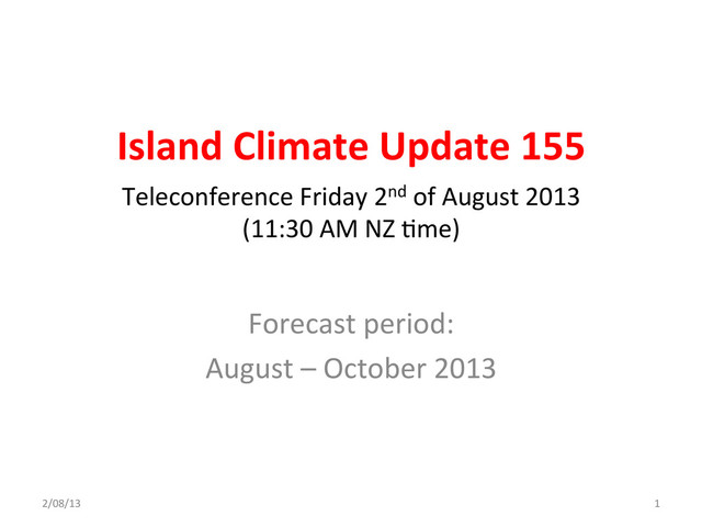 !!! August – October 2013 ICU Rainfall Guidance ISLAND PROBABILITY OUTLOOK CONFIDENCE Fiji 25 35 40 AVG - ABOVE High Niue 25 40 35 AVG - ABOVE High Papua New Guinea 25 40 35 AVG - ABOVE High Tonga 25 40 35 AVG - ABOVE High Austral Islands 30 40 30 NEAR NORMAL High Cook Islands (Southern) 30 40 30 NEAR NORMAL High New Caledonia 30 40 30 NEAR NORMAL High Pitcairn Island 30 40 30 NEAR NORMAL High Samoa 30 40 30 NEAR NORMAL High Society Islands 30 40 30 NEAR NORMAL High Solomon Islands 30 40 30 NEAR NORMAL Moderate-High Tokelau 30 40 30 NEAR NORMAL High Tuamotu Islands 30 40 30 NEAR NORMAL High Vanuatu 30 40 30 NEAR NORMAL High Wallis & Futuna 30 40 30 NEAR NORMAL Moderate-High Cook Islands (Northern) 35 40 25 AVG - BELOW High Tuvalu 35 40 25 AVG - BELOW High FSM 35 40 25 AVG - BELOW High Kiribati (Western) 40 35 25 AVG - BELOW Moderate-High Marquesas 40 35 25 AVG - BELOW High Kiribati (Eastern) 45 35 20 BELOW Moderate-High Rainfall outcomes estimated from an average of dynamical and statistical models for the Pacific Ocean region. The first three columns indicate the probability for rainfall occurring in one of three terciles (lower-L, middle-M, upper-U). The fourth column is an overall assessment of the expected rainfall relative to normal for the time of year. The final column is an indication of the confidence in the forecast, and is determined by how well individual models (shown in the next table) agree. Island groups listed above are ranked from above to