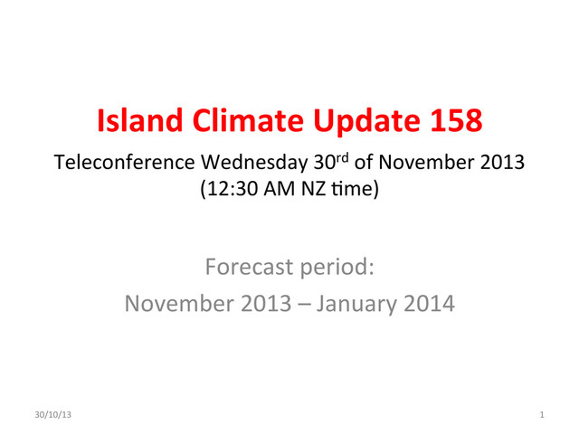 !!! November 2013 – January 2014 ICU Rainfall Guidance ISLAND PROBABILITY OUTLOOK CONFIDENCE Cook Islands (Southern) 25 40 35 AVG - ABOVE High Papua New Guinea 25 40 35 AVG - ABOVE High Tonga 25 40 35 AVG - ABOVE High FSM 25 40 35 AVG - ABOVE High Austral Islands 30 40 30 NEAR NORMAL High Cook Islands (Northern) 30 40 30 NEAR NORMAL High Fiji 30 40 30 NEAR NORMAL High New Caledonia 30 40 30 NEAR NORMAL High Niue 30 40 30 NEAR NORMAL High Samoa 30 40 30 NEAR NORMAL Moderate-High Society Islands 30 40 30 NEAR NORMAL High Solomon Islands 30 40 30 NEAR NORMAL High Tokelau 30 40 30 NEAR NORMAL High Vanuatu 30 40 30 NEAR NORMAL High Wallis & Futuna 30 40 30 NEAR NORMAL High Kiribati (Western) 35 40 25 AVG - BELOW Moderate-High Pitcairn Island 35 40 25 AVG - BELOW High Tuvalu 35 40 25 AVG - BELOW High Kiribati (Eastern) 40 35 25 AVG - BELOW Moderate-High Marquesas 40 35 25 AVG - BELOW High Tuamotu Islands 40 35 25 AVG - BELOW High Rainfall outcomes estimated from an average of dynamical and statistical models for the Pacific Ocean region. The first three columns indicate the probability for rainfall occurring in one of three terciles (lower-L, middle-M, upper-U). The fourth column is an overall assessment of the expected rainfall relative to normal for the time of year. The final column is an indication of the confidence in the forecast, and is determined by how well individual models (shown in the next table) agree. Island groups listed above are ranked from above to