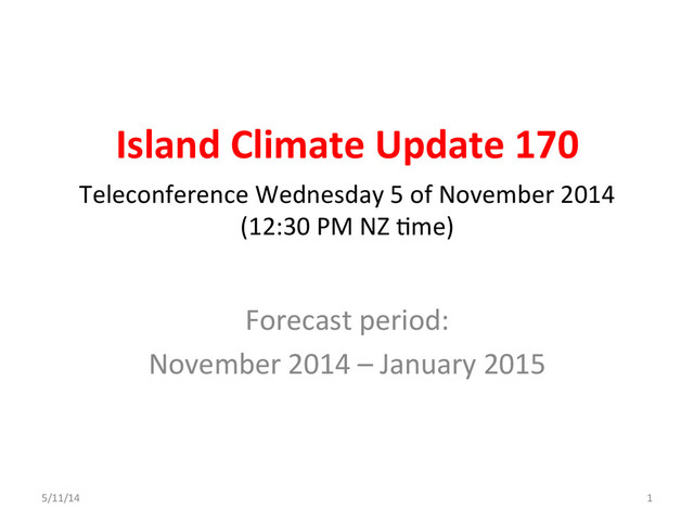 – January 2015 ICU Rainfall Guidance ISLAND PROBABILITY OUTLOOK CONFIDENCE Kiribati (Western) 25 35 40 AVG - ABOVE Moderate-High Papua New Guinea 25 35 40 AVG - ABOVE Moderate-High Solomon Islands 25 35 40 AVG - ABOVE Moderate-High Austral Islands 25 40 35 AVG - ABOVE High Cook Islands (Southern) 30 40 30 NEAR NORMAL High Niue 30 40 30 NEAR NORMAL High Pitcairn Island 30 40 30 NEAR NORMAL High Samoa 30 40 30 NEAR NORMAL Moderate-High Society Islands 30 35 35 CLIMATOLOGY Moderate Wallis & Futuna 30 40 30 NEAR NORMAL High Kiribati (Eastern) 35 35 30 CLIMATOLOGY Moderate Tokelau 35 35 30 CLIMATOLOGY Moderate Tuamotu Islands 35 35 30 CLIMATOLOGY Moderate Tuvalu 35 35 30 CLIMATOLOGY Moderate FSM 35 35 30 CLIMATOLOGY Moderate Cook Islands (Northern) 35 40 25 AVG - BELOW Moderate-High New Caledonia 35 40 25 AVG - BELOW High Tonga 35 40 25 AVG - BELOW High Fiji 40 35 25 AVG - BELOW High Marquesas 40 35 25 AVG - BELOW High Vanuatu 40 35 25 AVG - BELOW Moderate-High Rainfall outcomes estimated from an average of dynamical and statistical models for the Pacific Ocean region. The first three columns indicate the probability for rainfall occurring in one of three terciles (lower-L, middle-M, upper-U). The fourth column is an overall assessment of the expected rainfall relative to normal for the time of year.