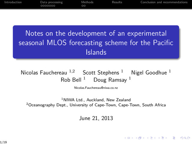 the development of an experimental seasonal MLOS forecasting scheme for the Pacific Islands Nicolas Fauchereau 1,2 Scott Stephens 1 Nigel Goodhue 1 Rob Bell 1 Doug Ramsay 1 [email protected] 1NIWA Ltd., Auckland, New Zealand 2Oceanography Dept., University of Cape-Town, Cape-Town, South Africa June 21, 2013 1/19