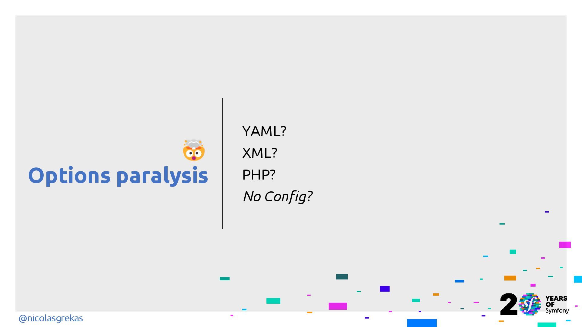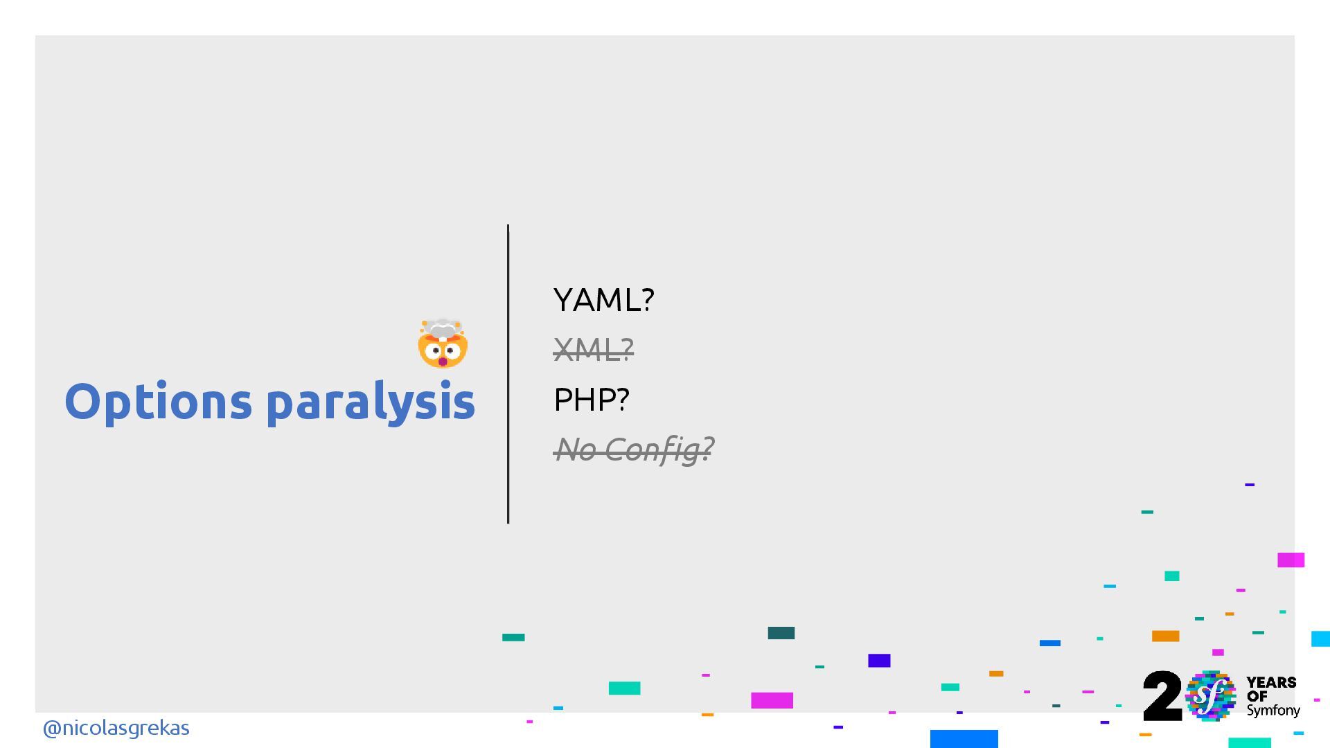 Options paralysis @nicolasgrekas YAML? XML? PHP? No Config?