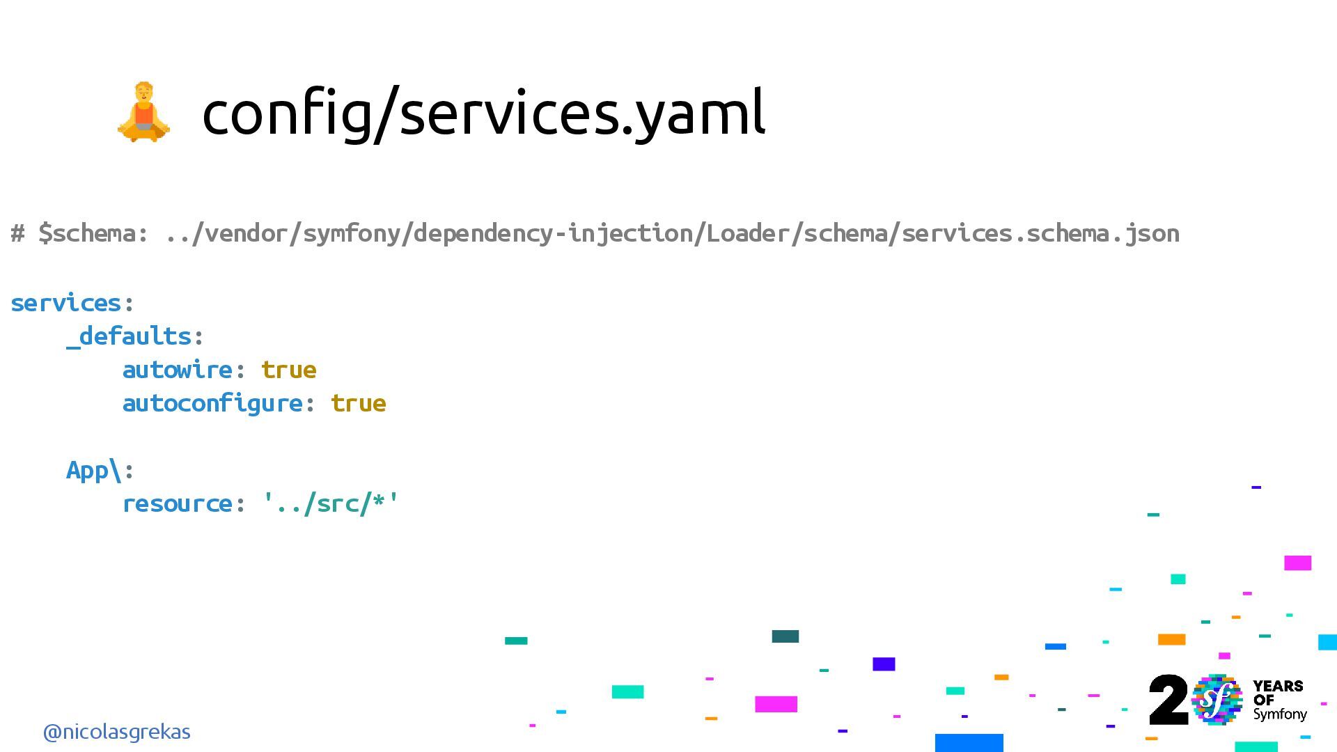 resource: '../src/*' exclude: '../src/{DependencyInjection,Entity,Migrations,Tests,Kernel.php}' App\Controller\: resource: '../src/Controller' tags: ['controller.service_arguments'] @nicolasgrekas