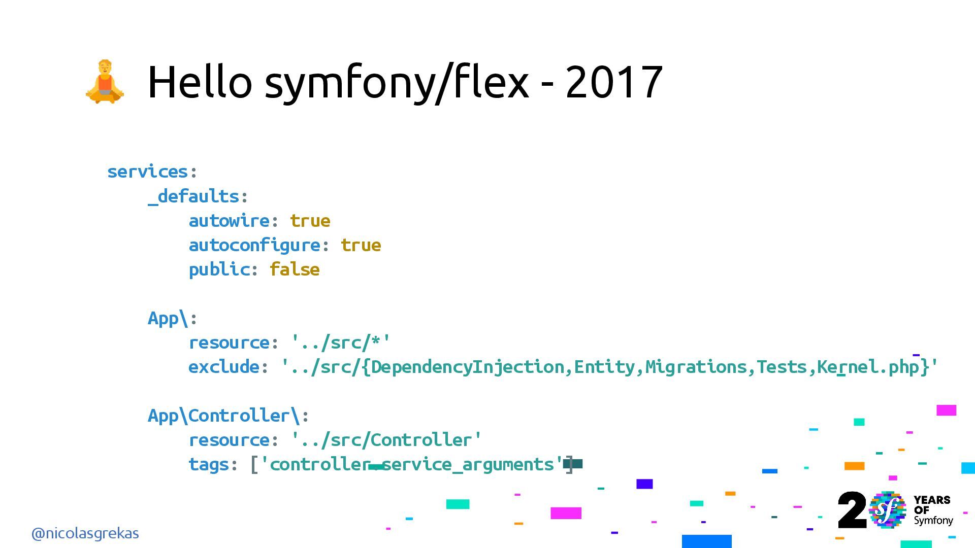 Hello symfony/flex - 2017 services: _defaults: autowire: true autoconfigure: true