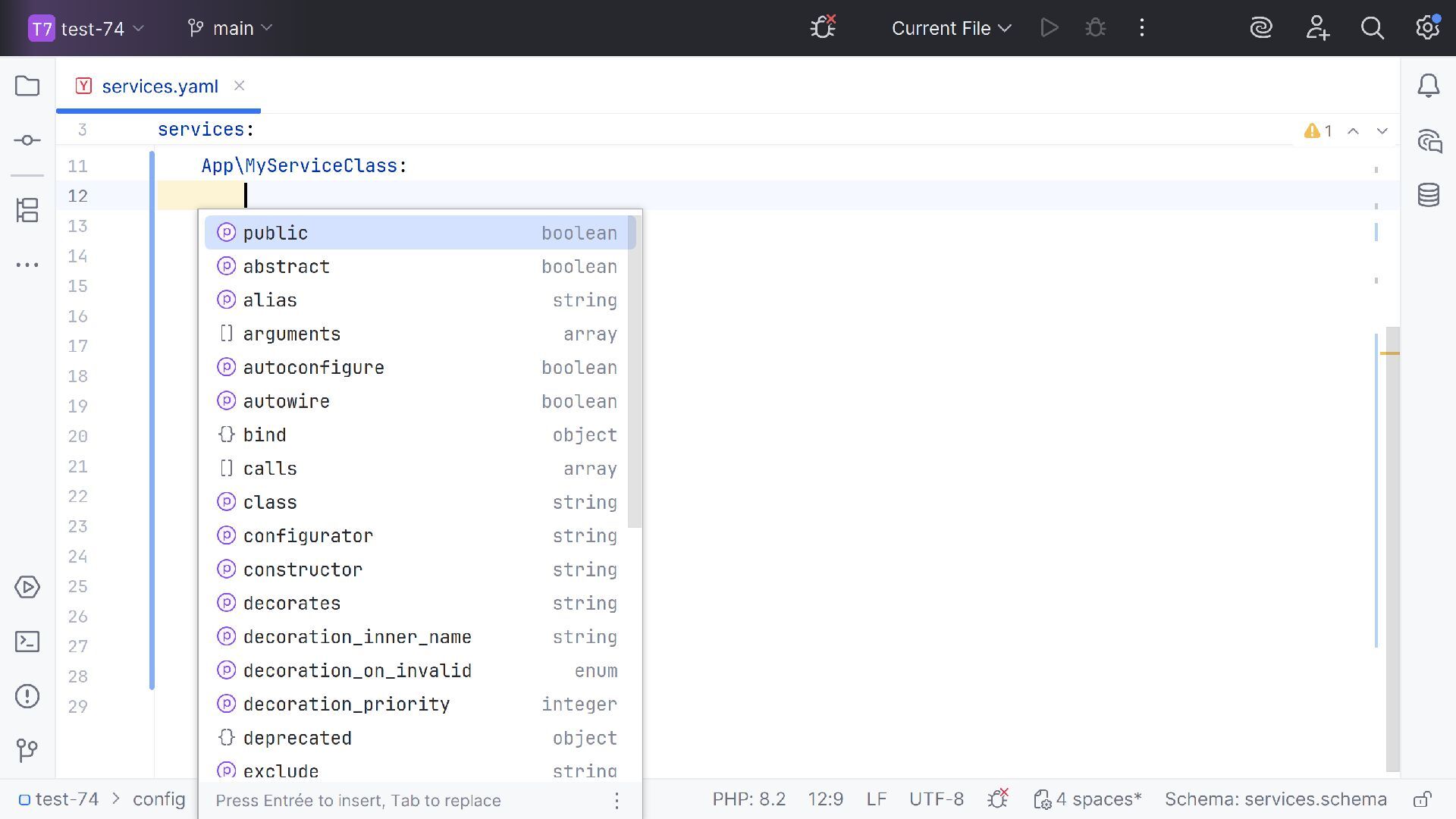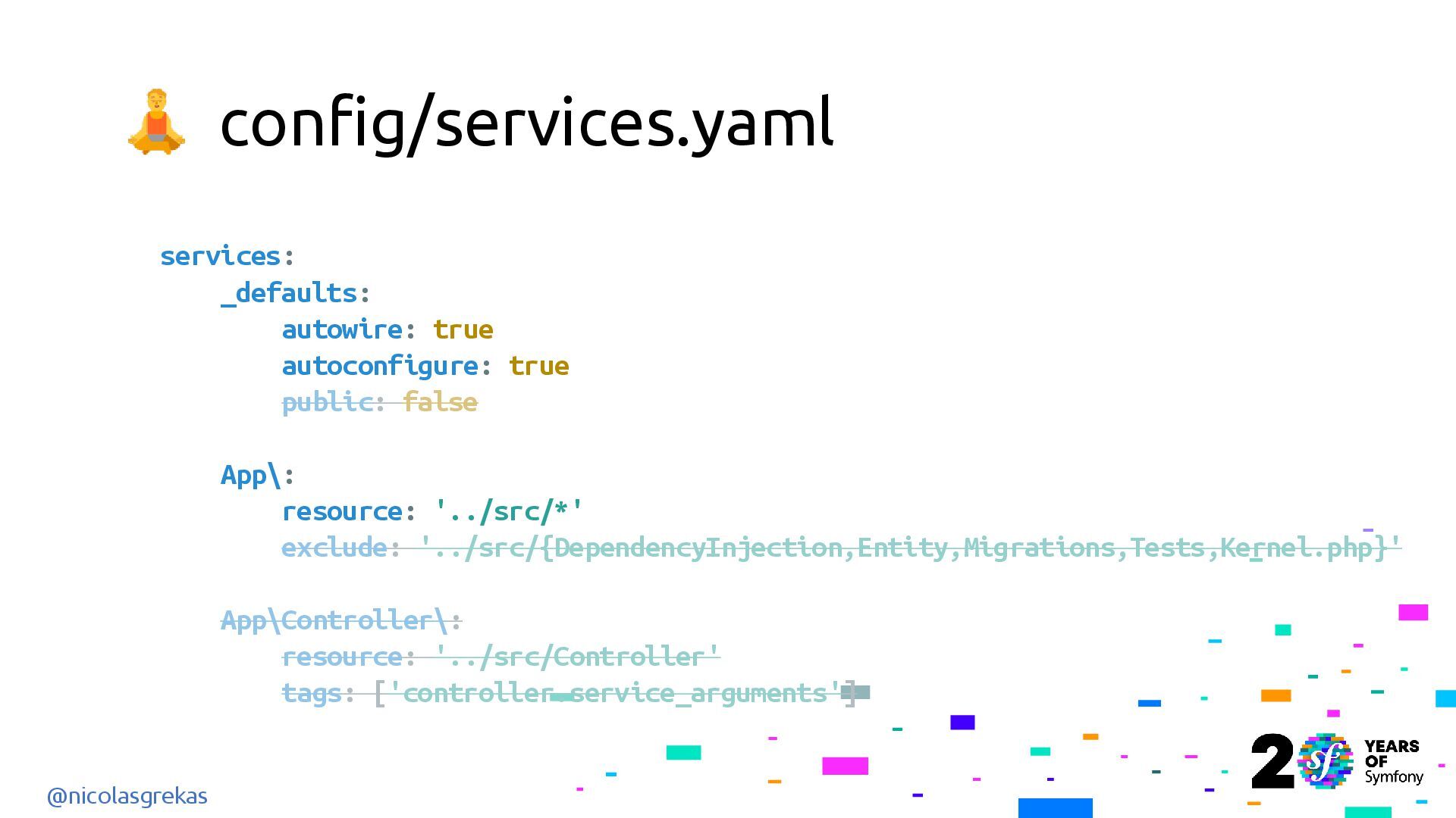 public: false App\: resource: '../src/*' exclude: '../src/{DependencyInjection,Entity,Migrations,Tests,Kernel.php}' App\Controller\: resource: '../src/Controller' tags: ['controller.service_arguments'] @nicolasgrekas