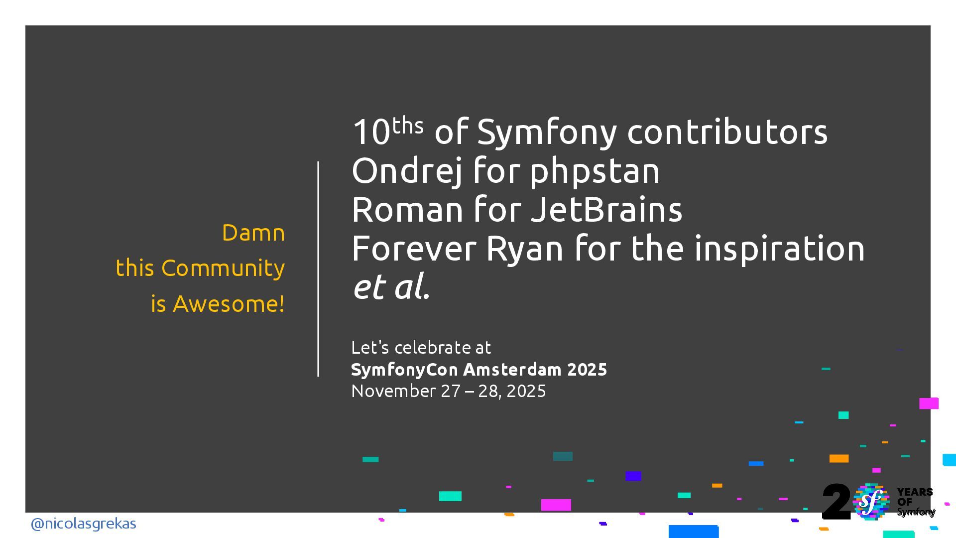 Forever Ryan for the inspiration et al. Damn this Community is Awesome! @nicolasgrekas Let's celebrate at SymfonyCon Amsterdam 2025 November 27 – 28, 2025