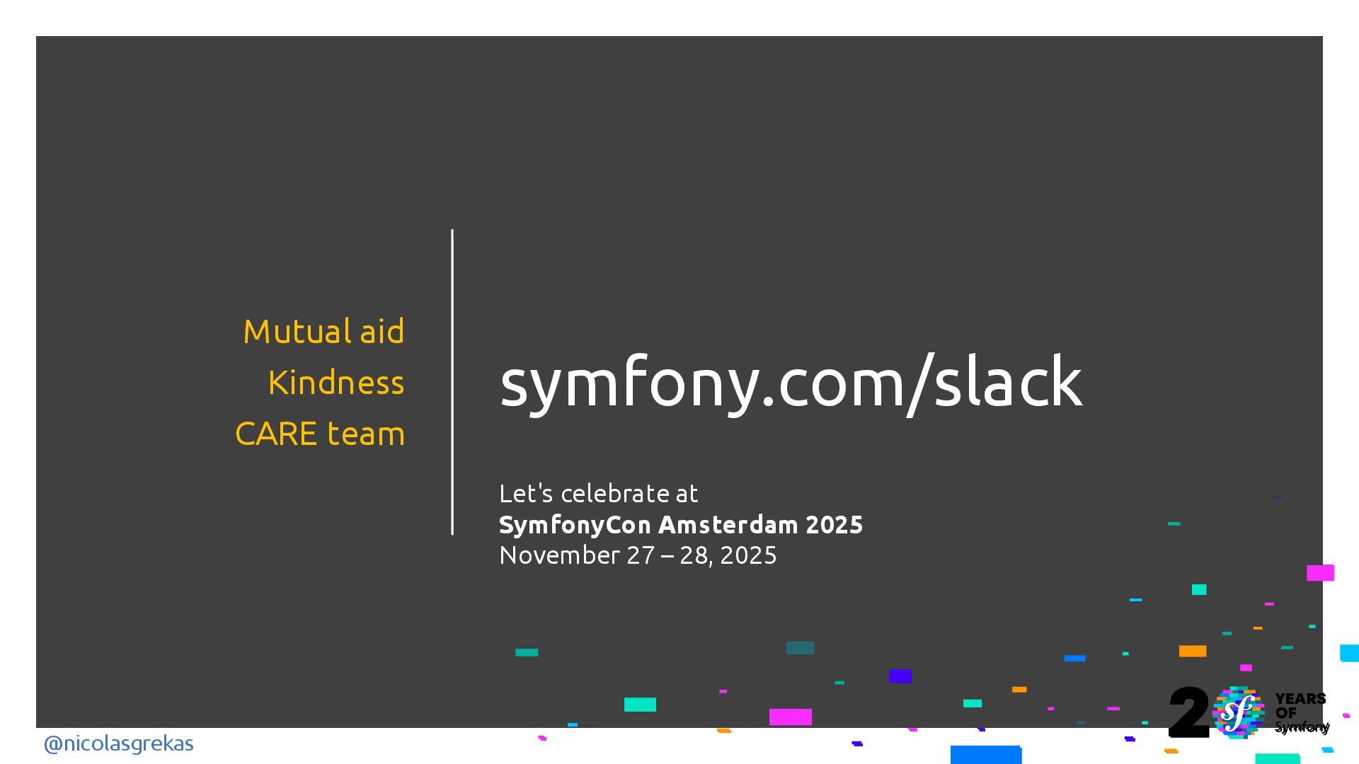 symfony.com/slack Mutual aid Kindness CARE team @nicolasgrekas Let's celebrate at