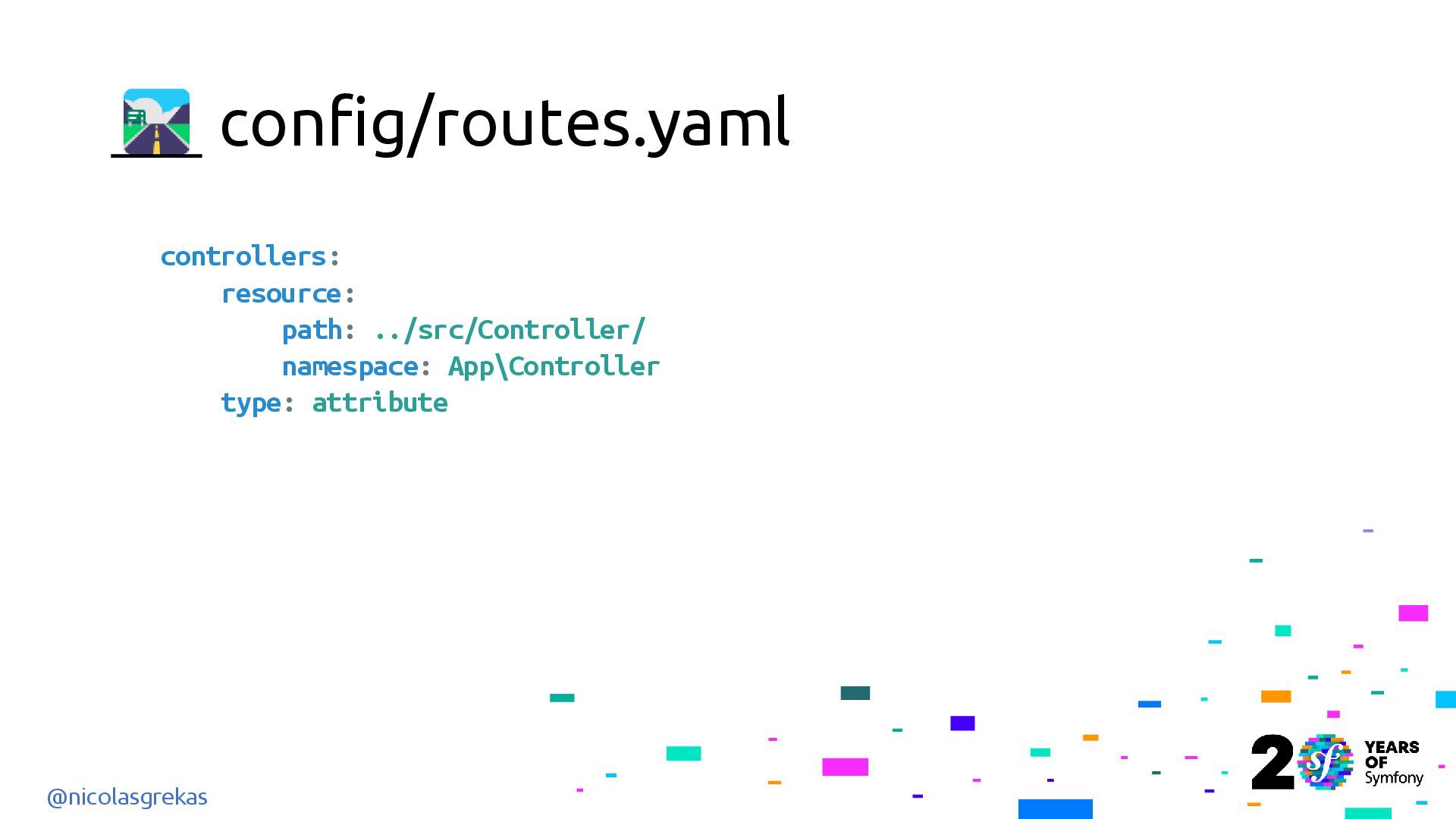 config/routes.yaml controllers: resource: path: ../src/Controller/ namespace: App\Controller type: attribute @nicolasgrekas