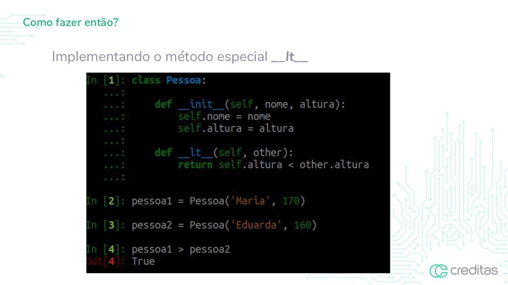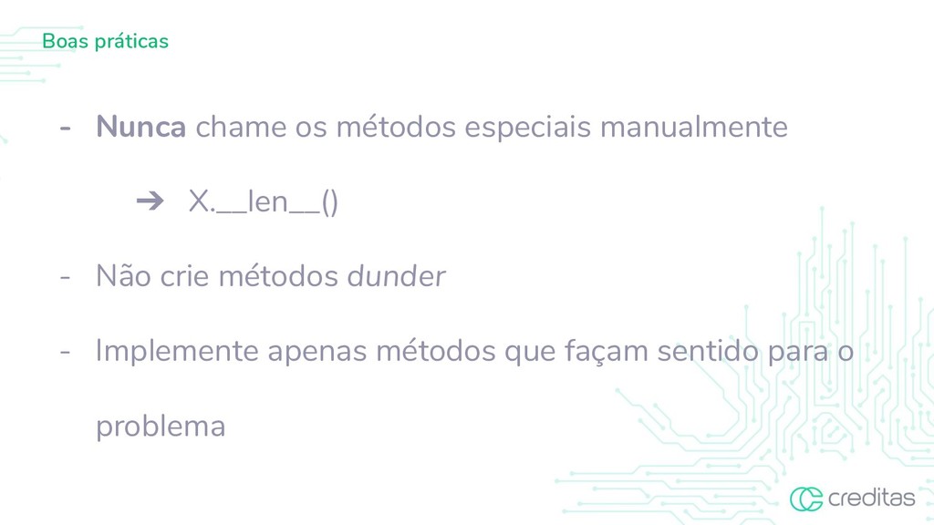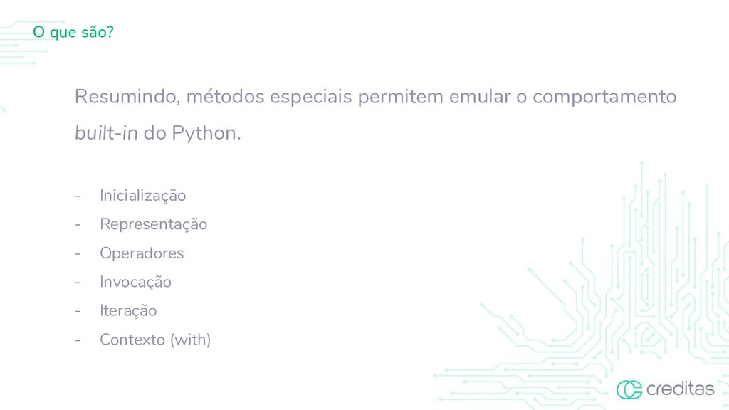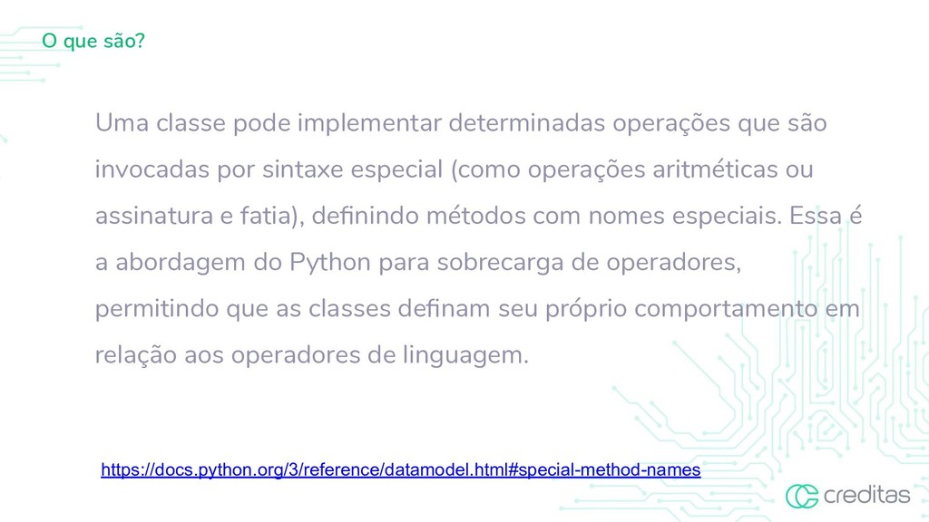 são invocadas por sintaxe especial (como operações aritméticas ou assinatura e fatia), definindo métodos com nomes especiais. Essa é a abordagem do Python para sobrecarga de operadores, permitindo que as classes definam seu próprio comportamento em relação aos operadores de linguagem. https://docs.python.org/3/reference/datamodel.html#special-method-names