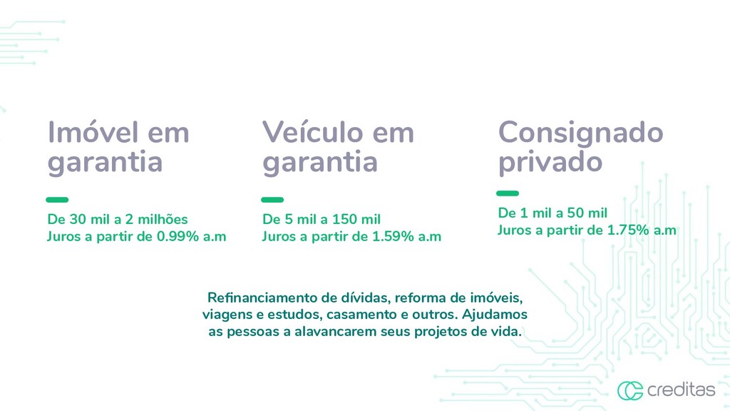a partir de 0.99% a.m Veículo em garantia De 5 mil a 150 mil Juros a partir de 1.59% a.m Consignado privado De 1 mil a 50 mil Juros a partir de 1.75% a.m Refinanciamento de dívidas, reforma de imóveis, viagens e estudos, casamento e outros. Ajudamos as pessoas a alavancarem seus projetos de vida.