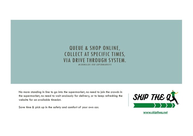 THROUGH SYSTEM. MCDONALDS FOR SUPERMARKETS No more standing in line to go into the supermarket, no need to join the crowds in the supermarket, no need to wait anxiously for delivery, or to keep refreshing the website for an available timeslot. Save time & pick up in the safety and comfort of your own car. www.skiptheq.net