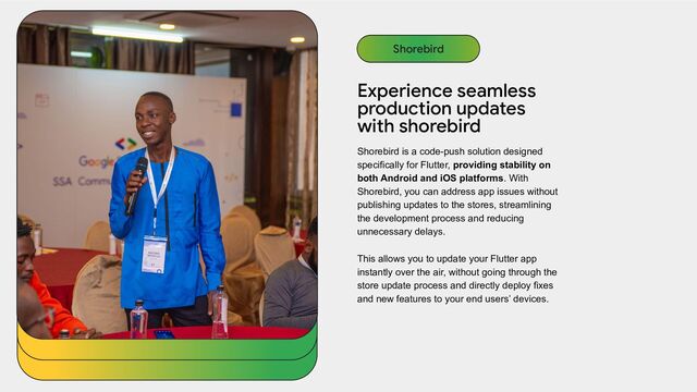 solution designed specifically for Flutter, providing stability on both Android and iOS platforms. With Shorebird, you can address app issues without publishing updates to the stores, streamlining the development process and reducing unnecessary delays. This allows you to update your Flutter app instantly over the air, without going through the store update process and directly deploy fixes and new features to your end users’ devices. Shorebird