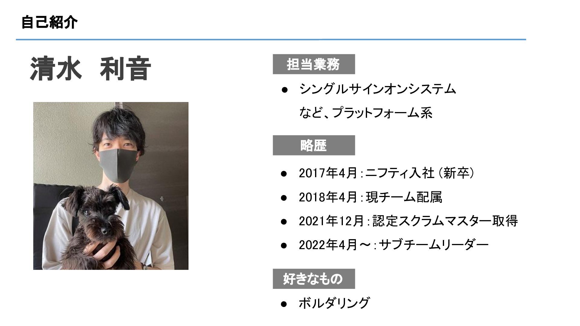 自己紹介 清水 利音 好きなもの • ボルダリング 担当業務 略歴 • 2017年4月:ニフティ入社
