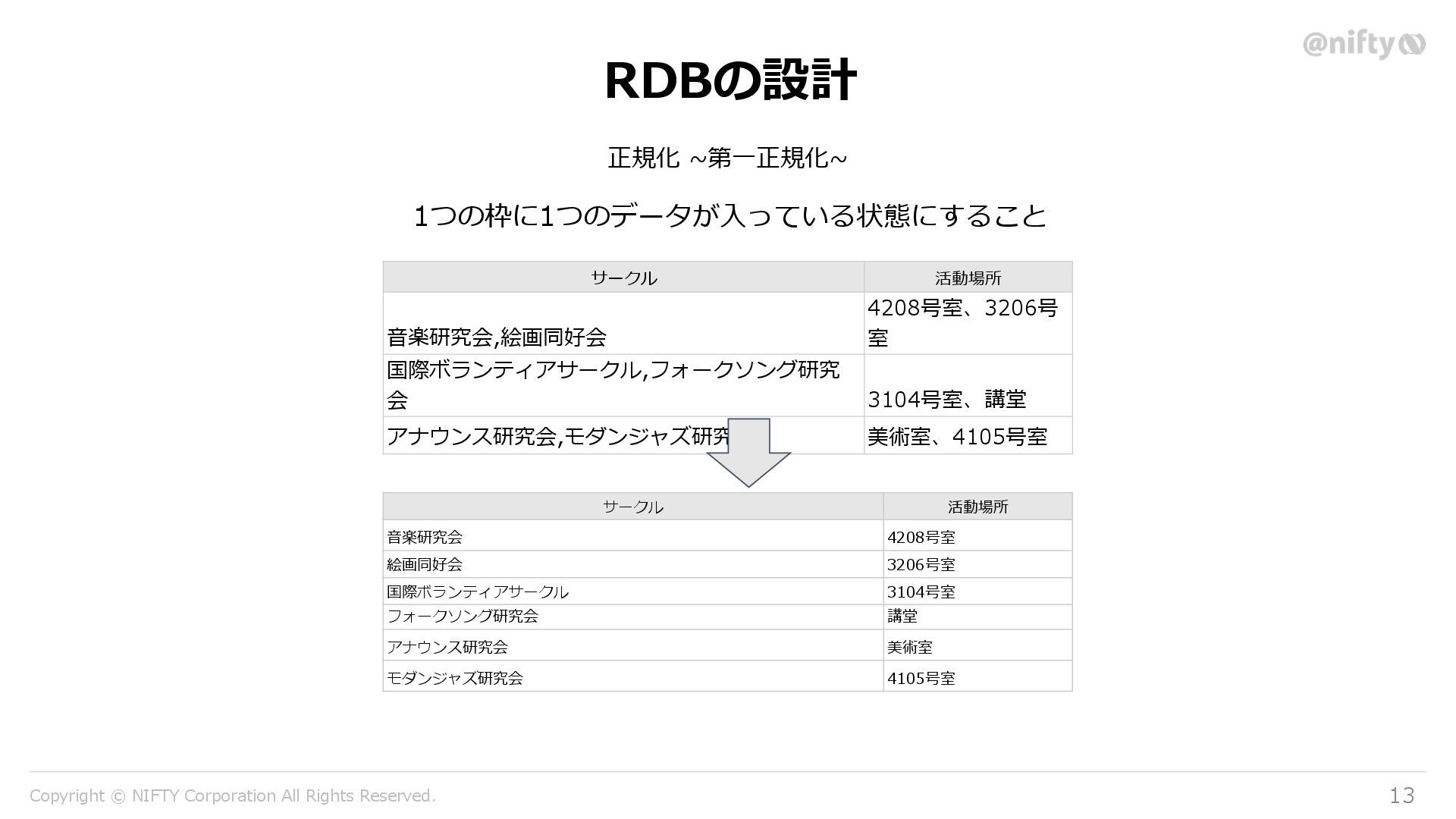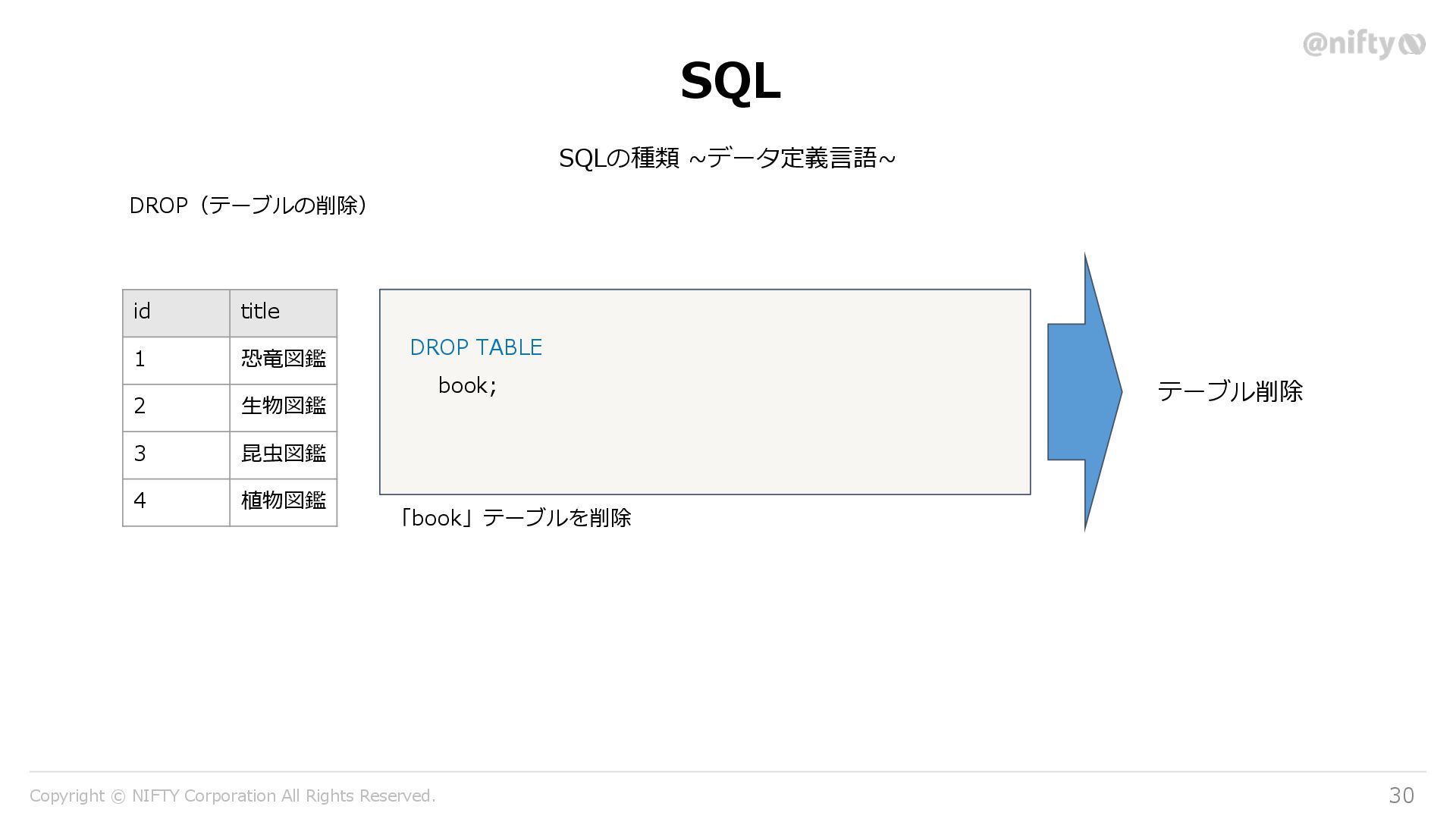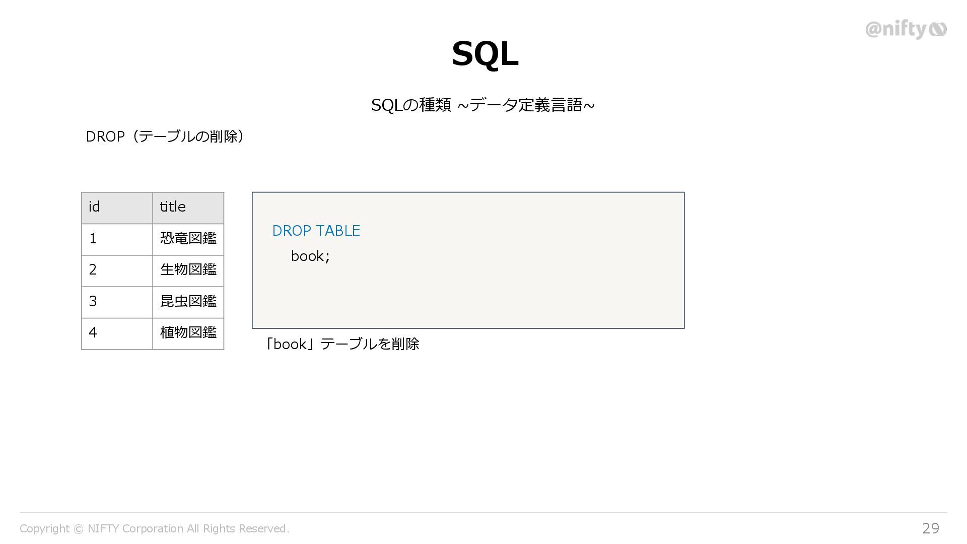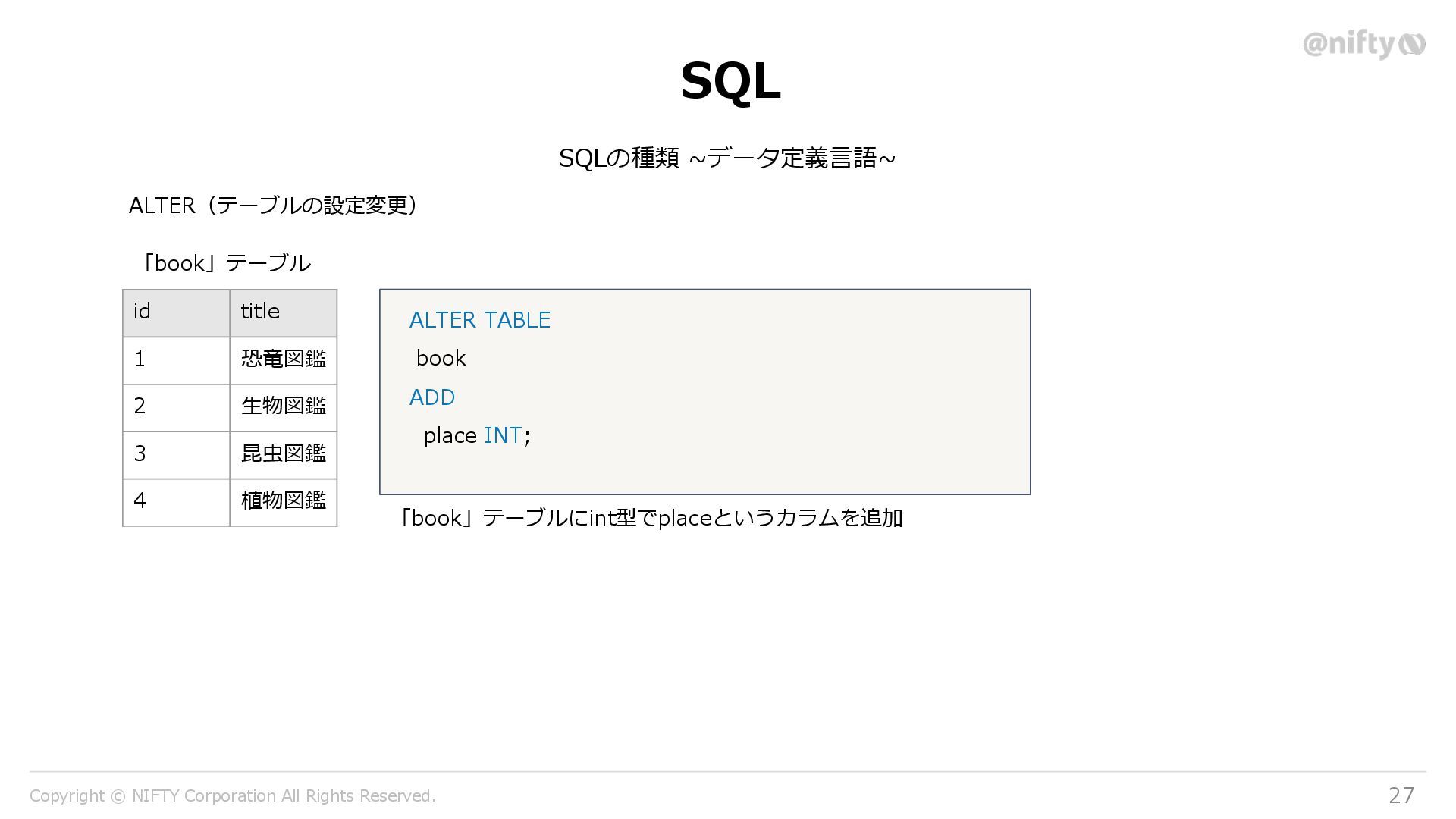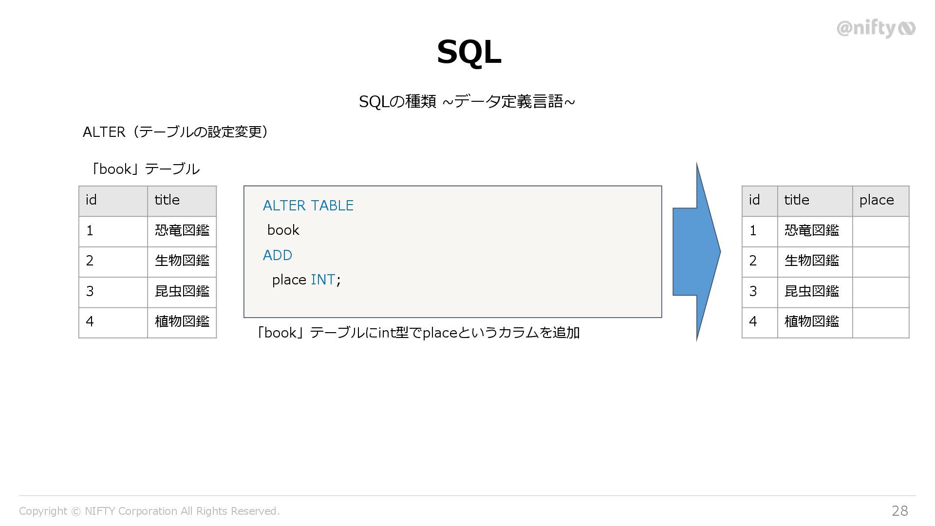 ~データ定義⾔語~ id title 1 恐⻯図鑑 2 ⽣物図鑑 3 昆⾍図鑑 4 植物図鑑 ALTER(テーブルの設定変更) 「book」テーブルにint型でplaceというカラムを追加 「book」テーブル ALTER TABLE book ADD place INT; id title place 1 恐⻯図鑑 2 ⽣物図鑑 3 昆⾍図鑑 4 植物図鑑