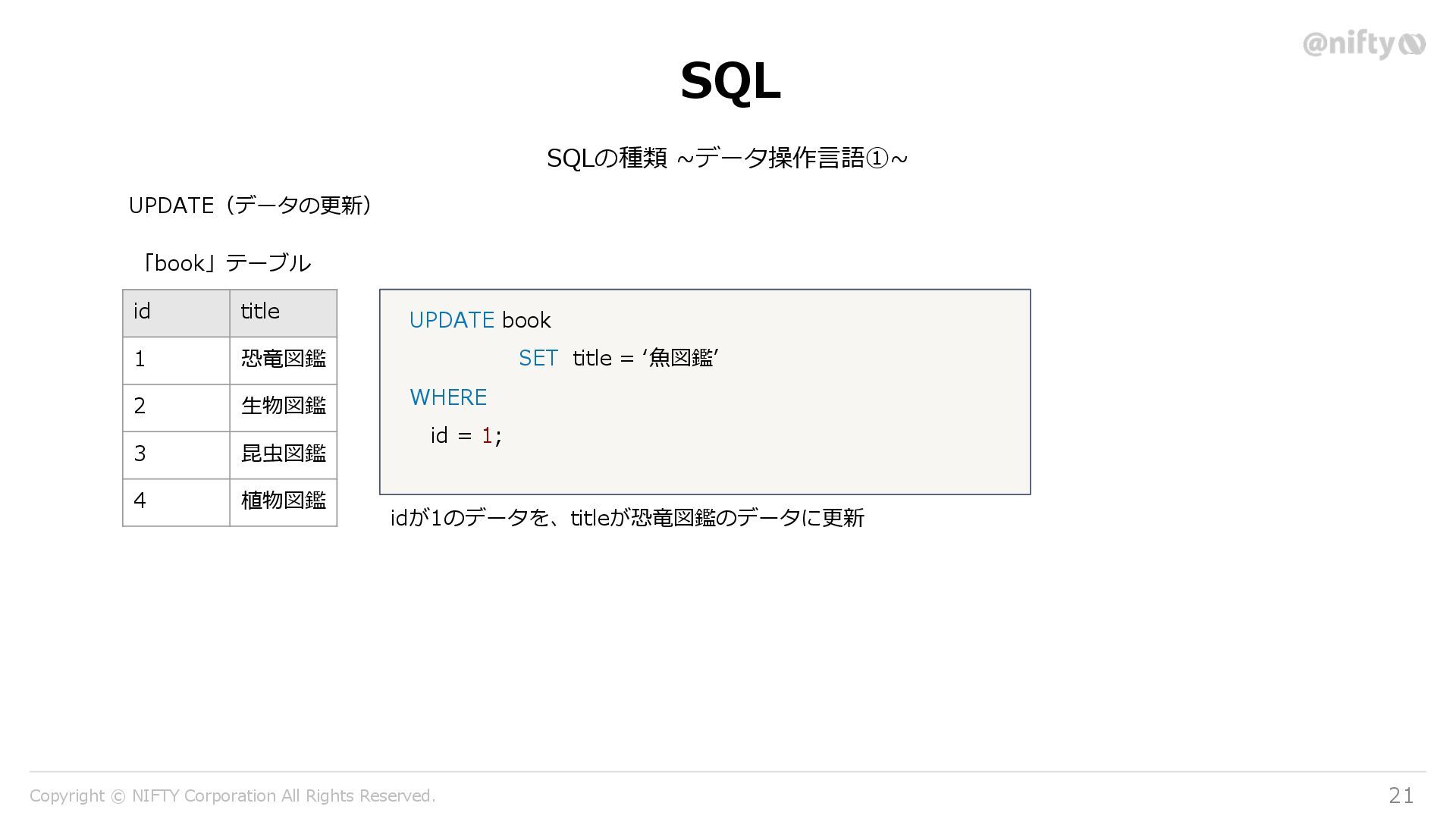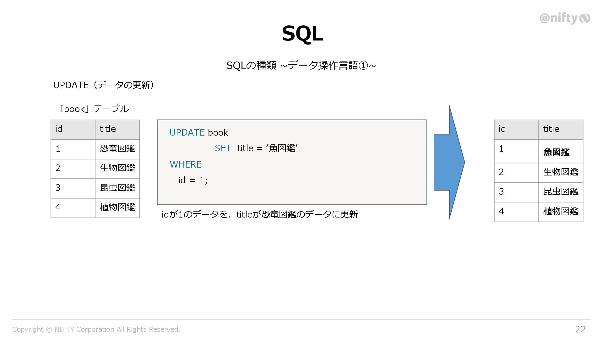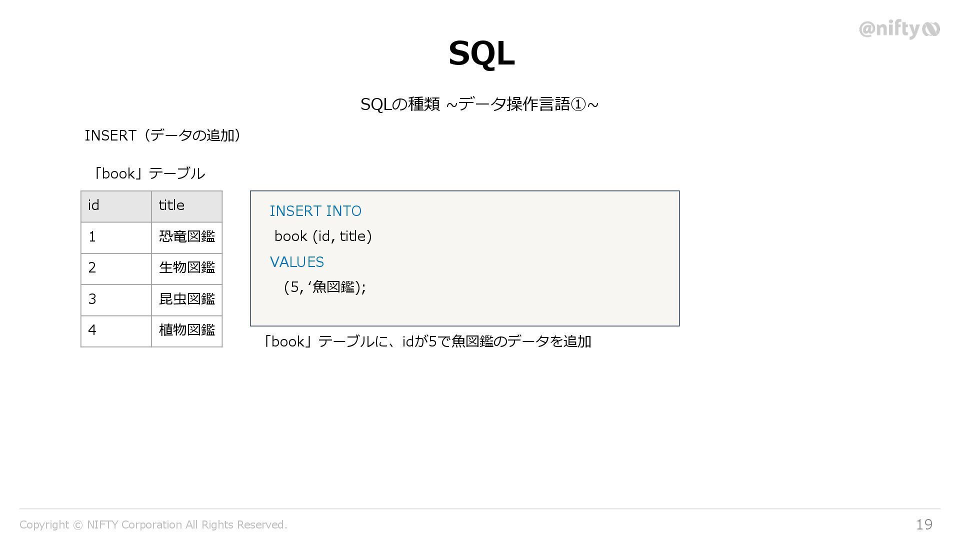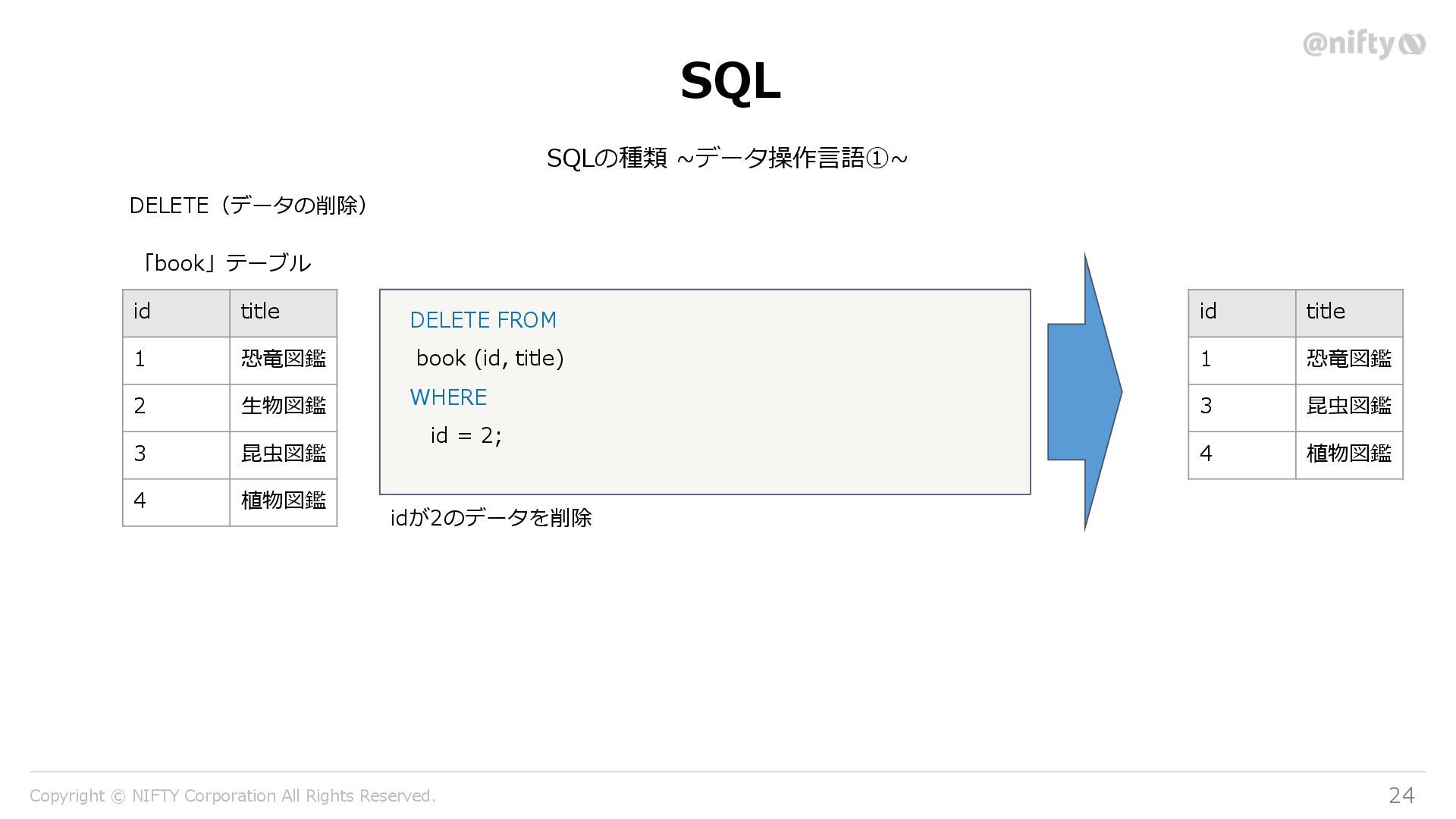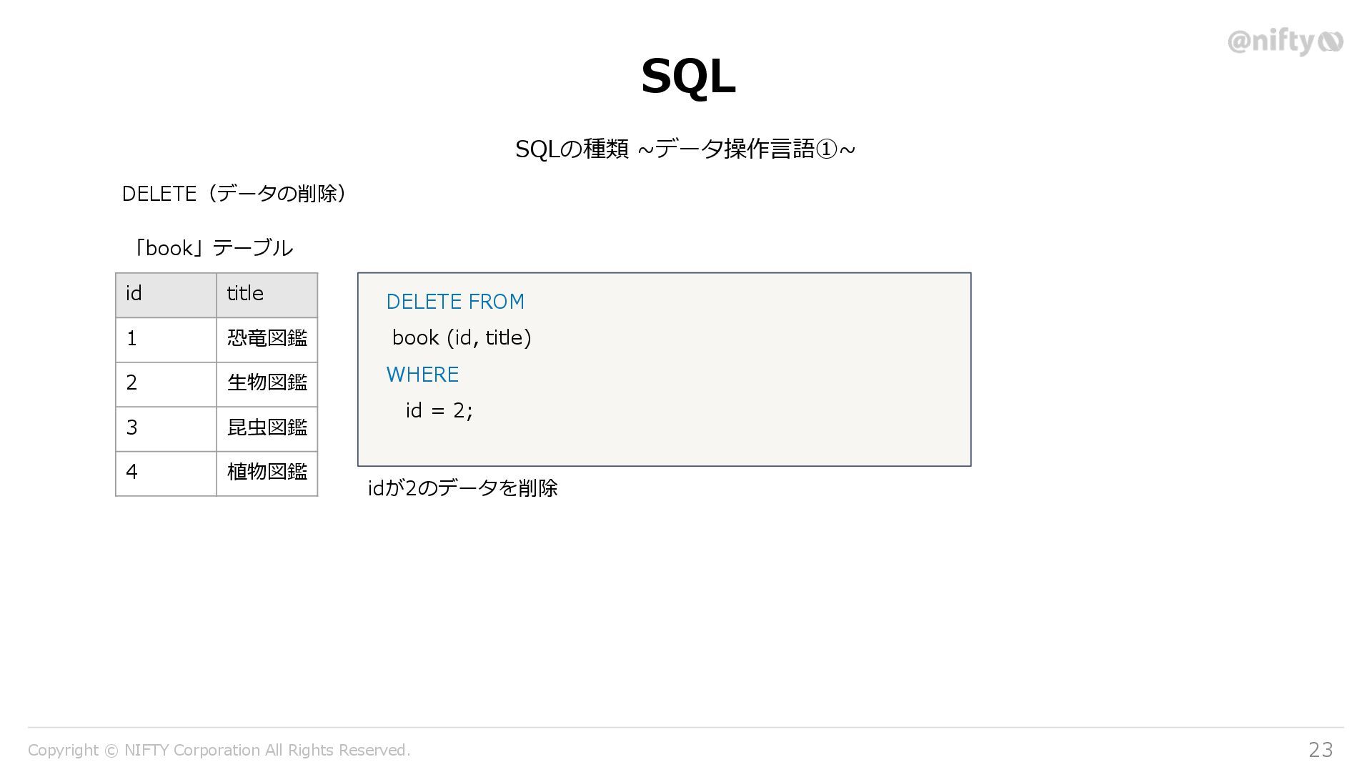 ~データ操作⾔語①~ id title 1 恐⻯図鑑 2 ⽣物図鑑 3 昆⾍図鑑 4 植物図鑑 DELETE(データの削除) idが2のデータを削除 「book」テーブル DELETE FROM book (id, title) WHERE id = 2; id title 1 恐⻯図鑑 3 昆⾍図鑑 4 植物図鑑