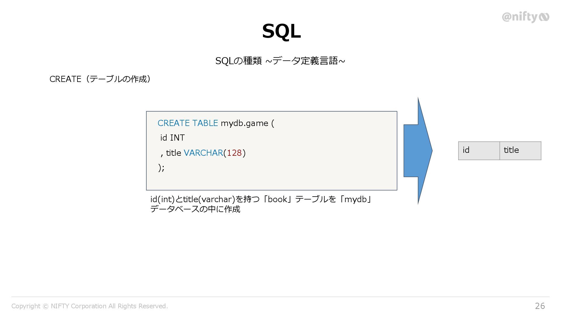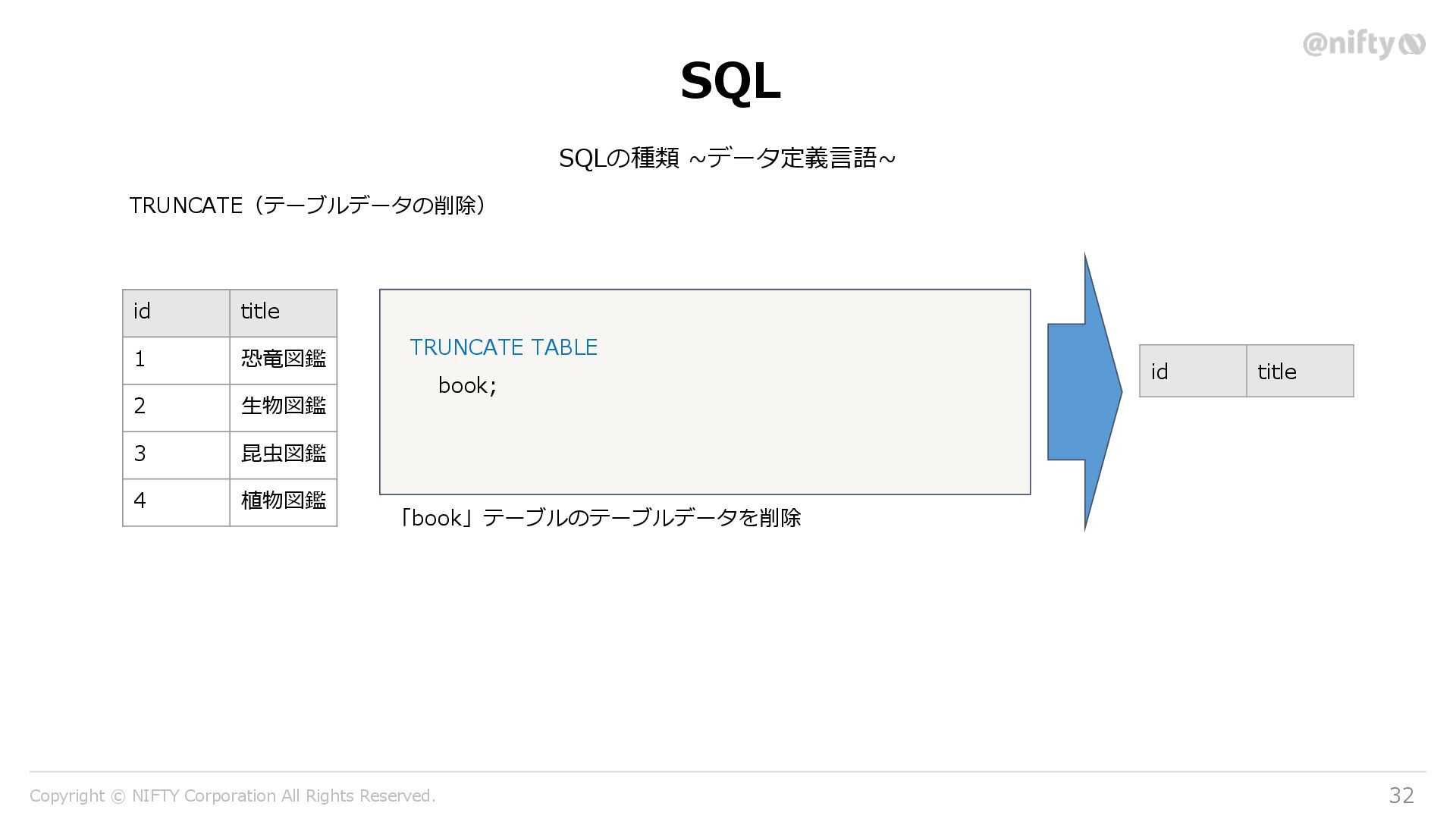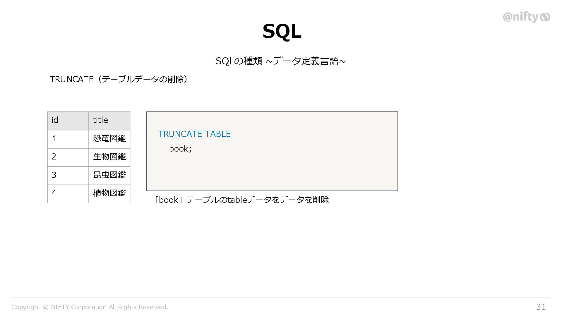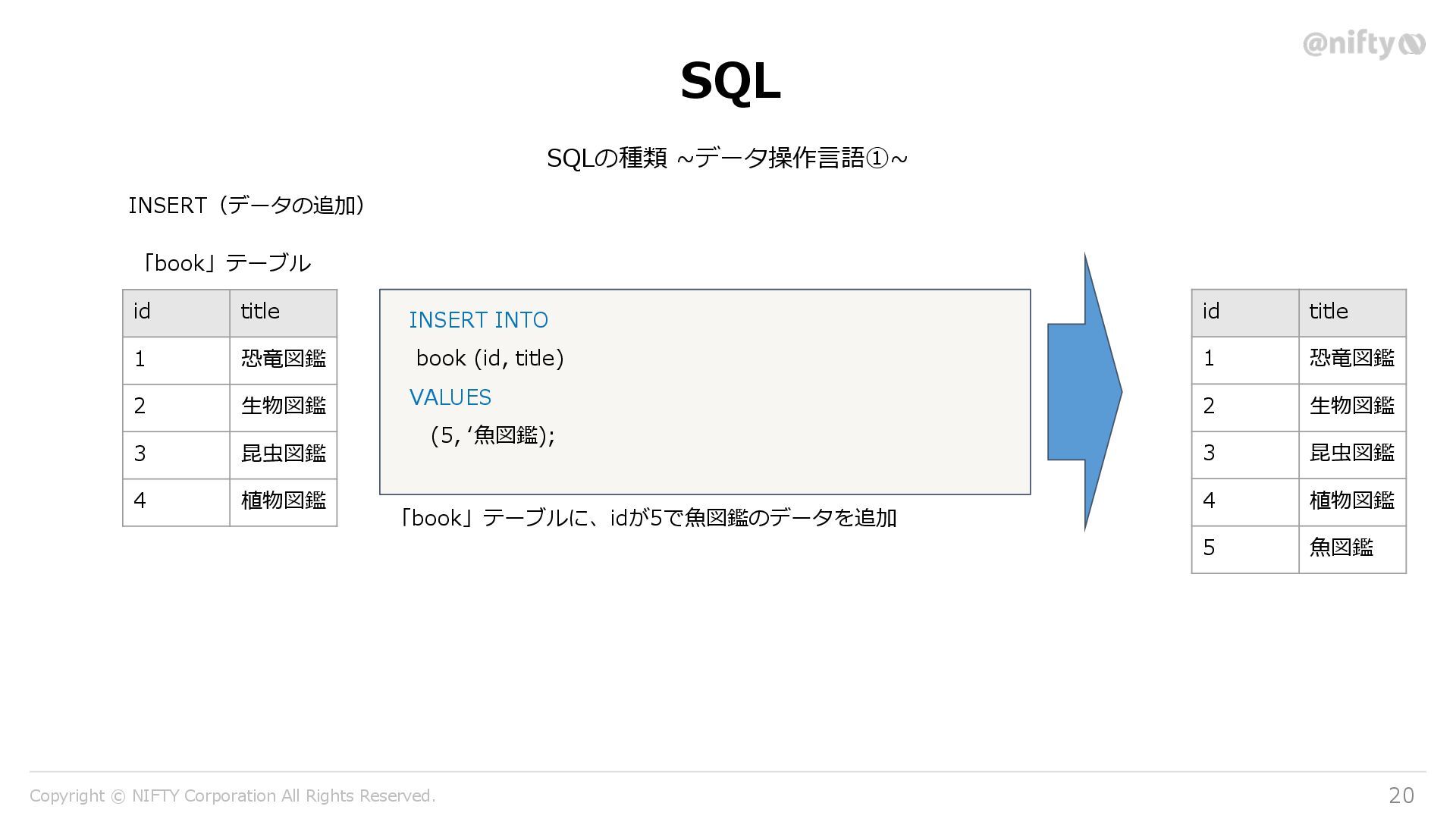 ~データ操作⾔語①~ id title 1 恐⻯図鑑 2 ⽣物図鑑 3 昆⾍図鑑 4 植物図鑑 DELETE(データの削除) idが2のデータを削除 「book」テーブル DELETE FROM book (id, title) WHERE id = 2; id title 1 恐⻯図鑑 3 昆⾍図鑑 4 植物図鑑