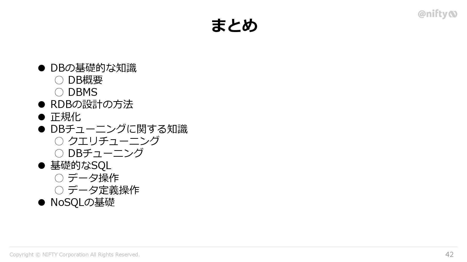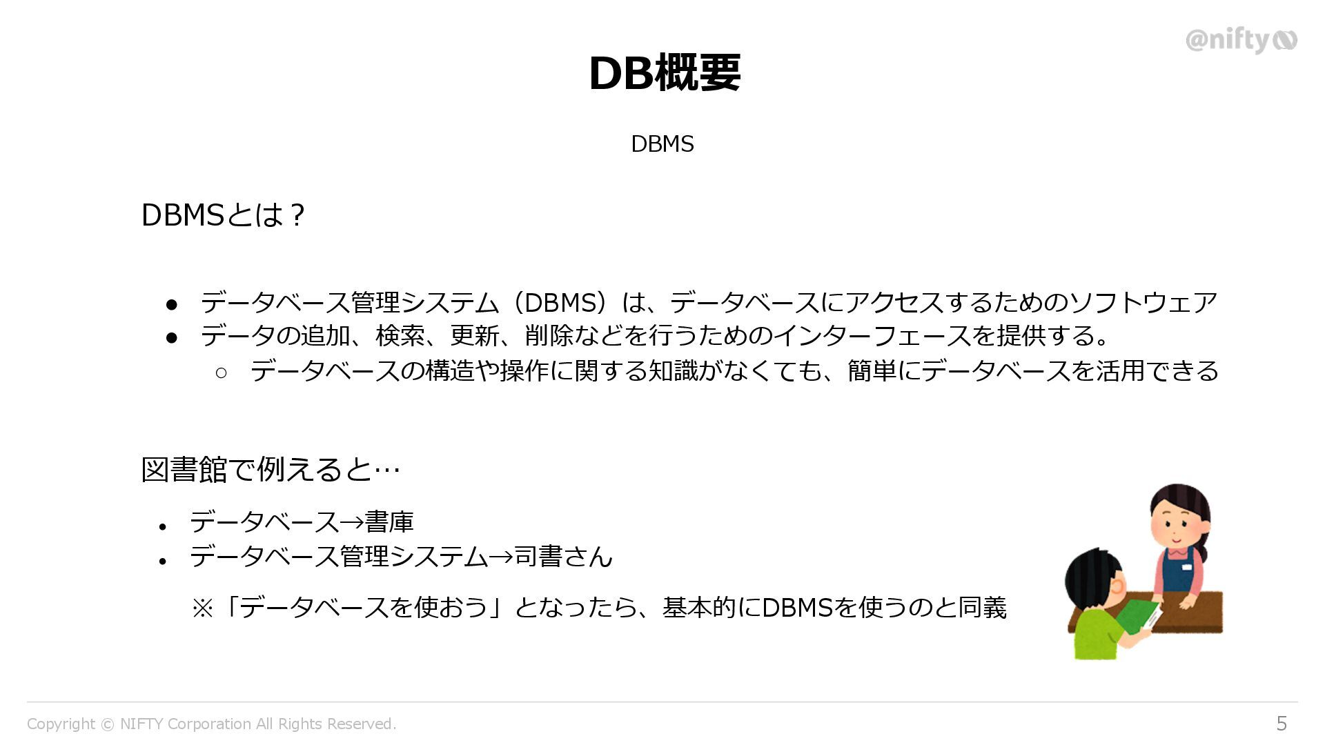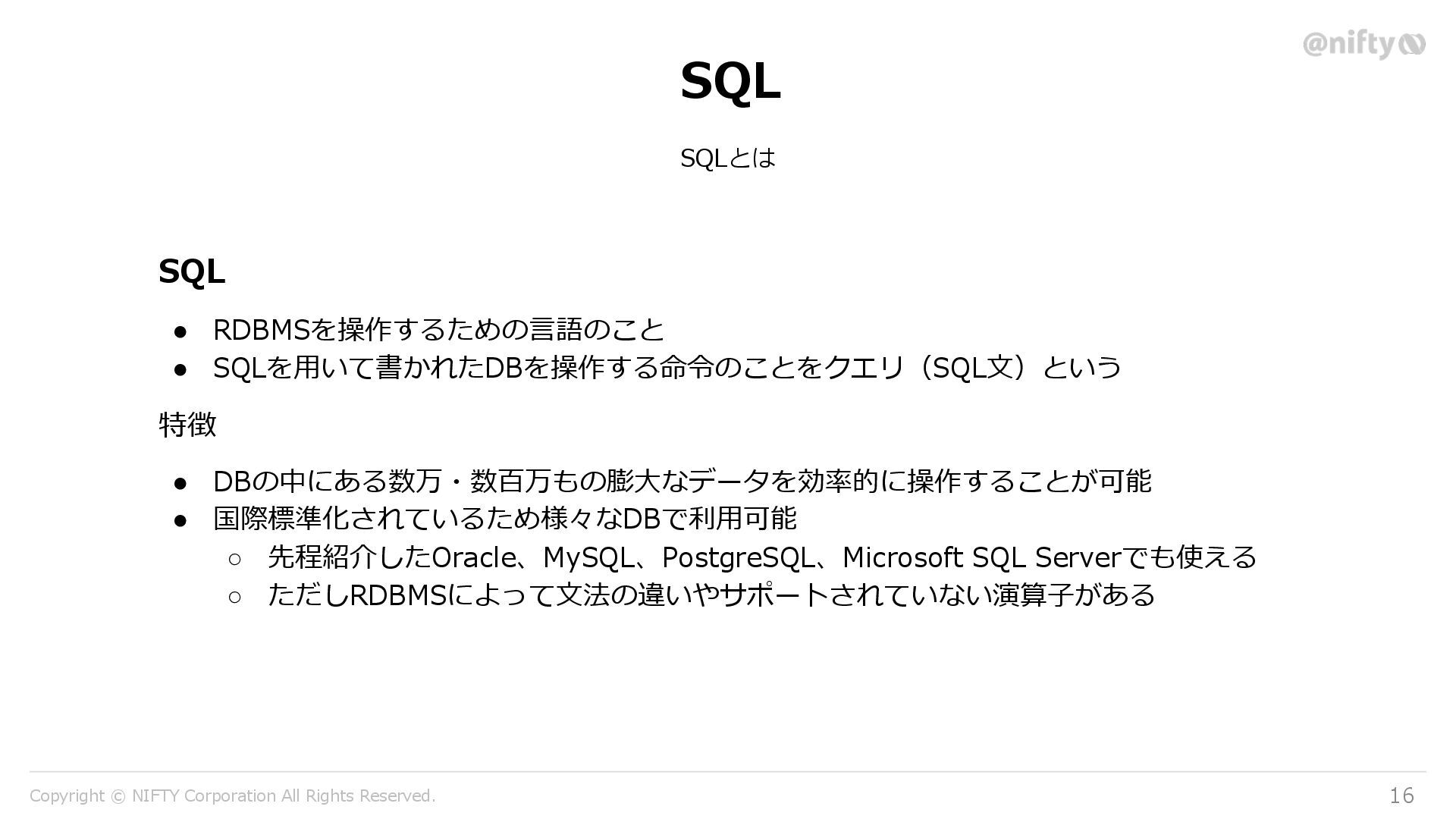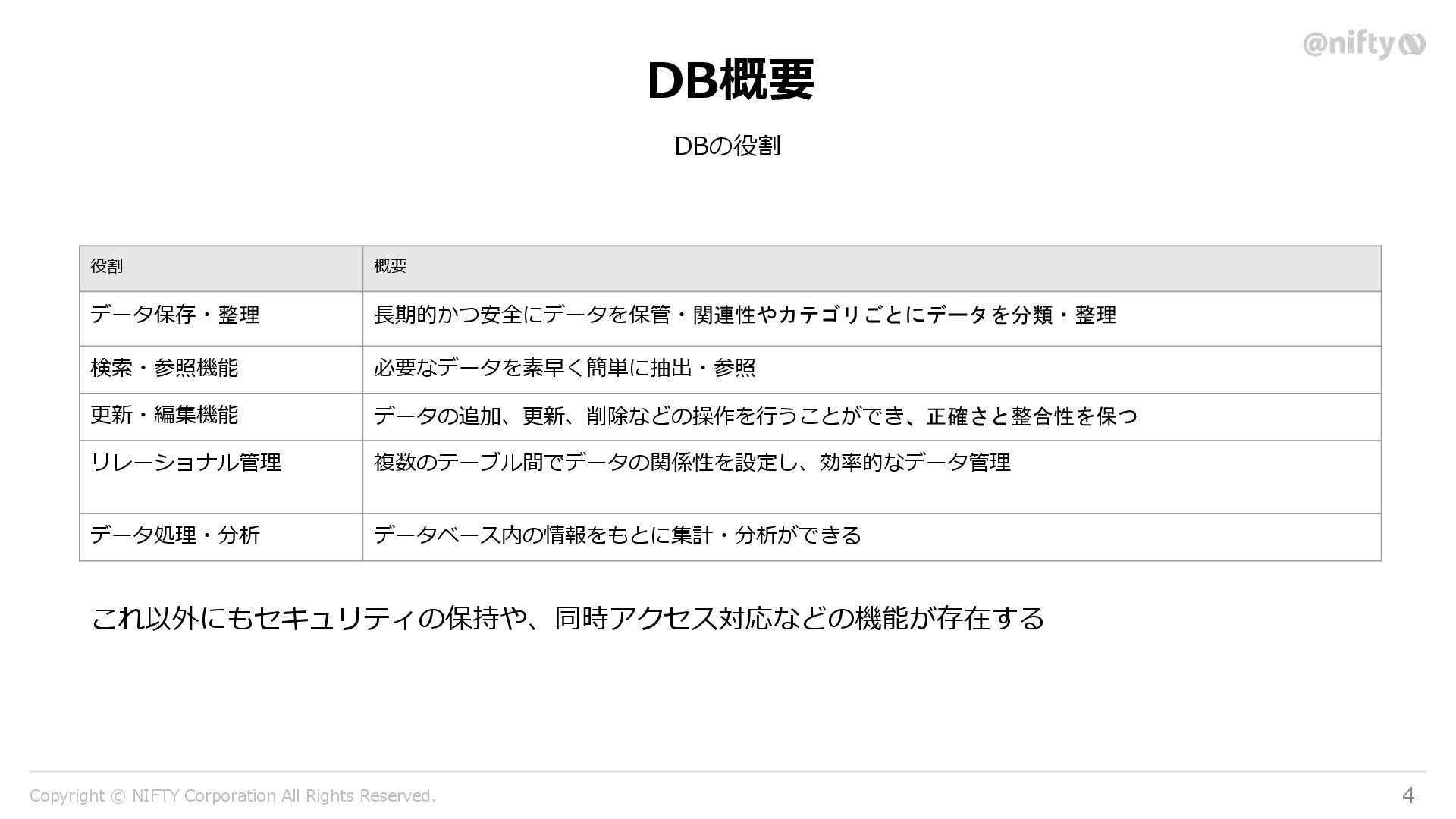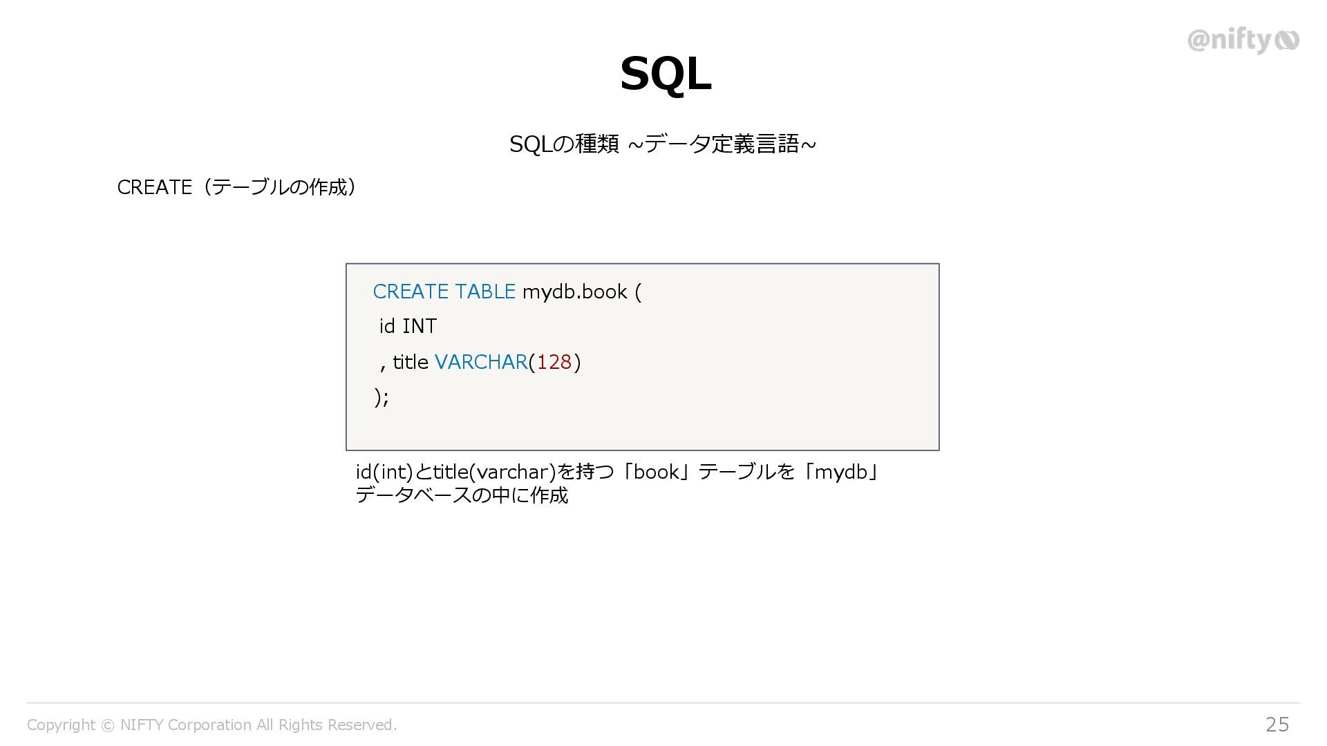 ~データ操作⾔語①~ id title 1 恐⻯図鑑 2 ⽣物図鑑 3 昆⾍図鑑 4 植物図鑑 DELETE(データの削除) idが2のデータを削除 「book」テーブル DELETE FROM book (id, title) WHERE id = 2; id title 1 恐⻯図鑑 3 昆⾍図鑑 4 植物図鑑
