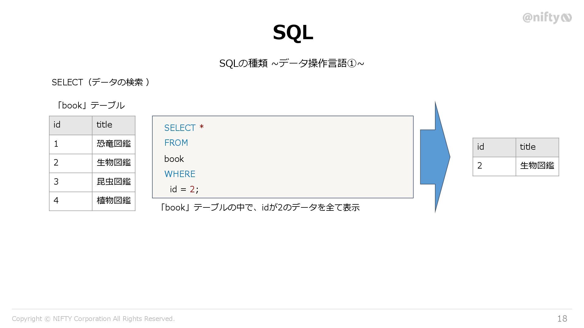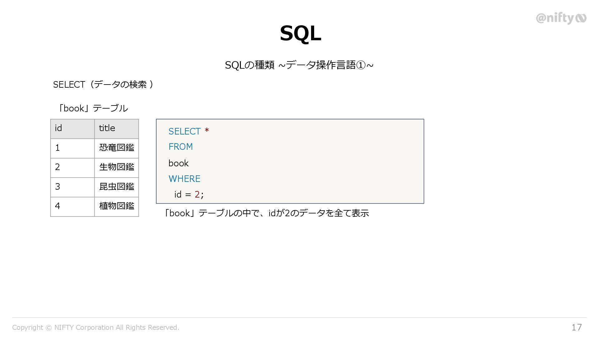 ~データ操作⾔語①~ id title 1 恐⻯図鑑 2 ⽣物図鑑 3 昆⾍図鑑 4 植物図鑑 SELECT * FROM book WHERE id = 2; SELECT(データの検索 ) id title 2 ⽣物図鑑 「book」テーブルの中で、idが2のデータを全て表⽰ 「book」テーブル
