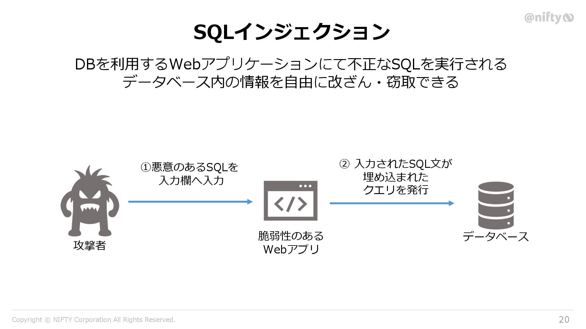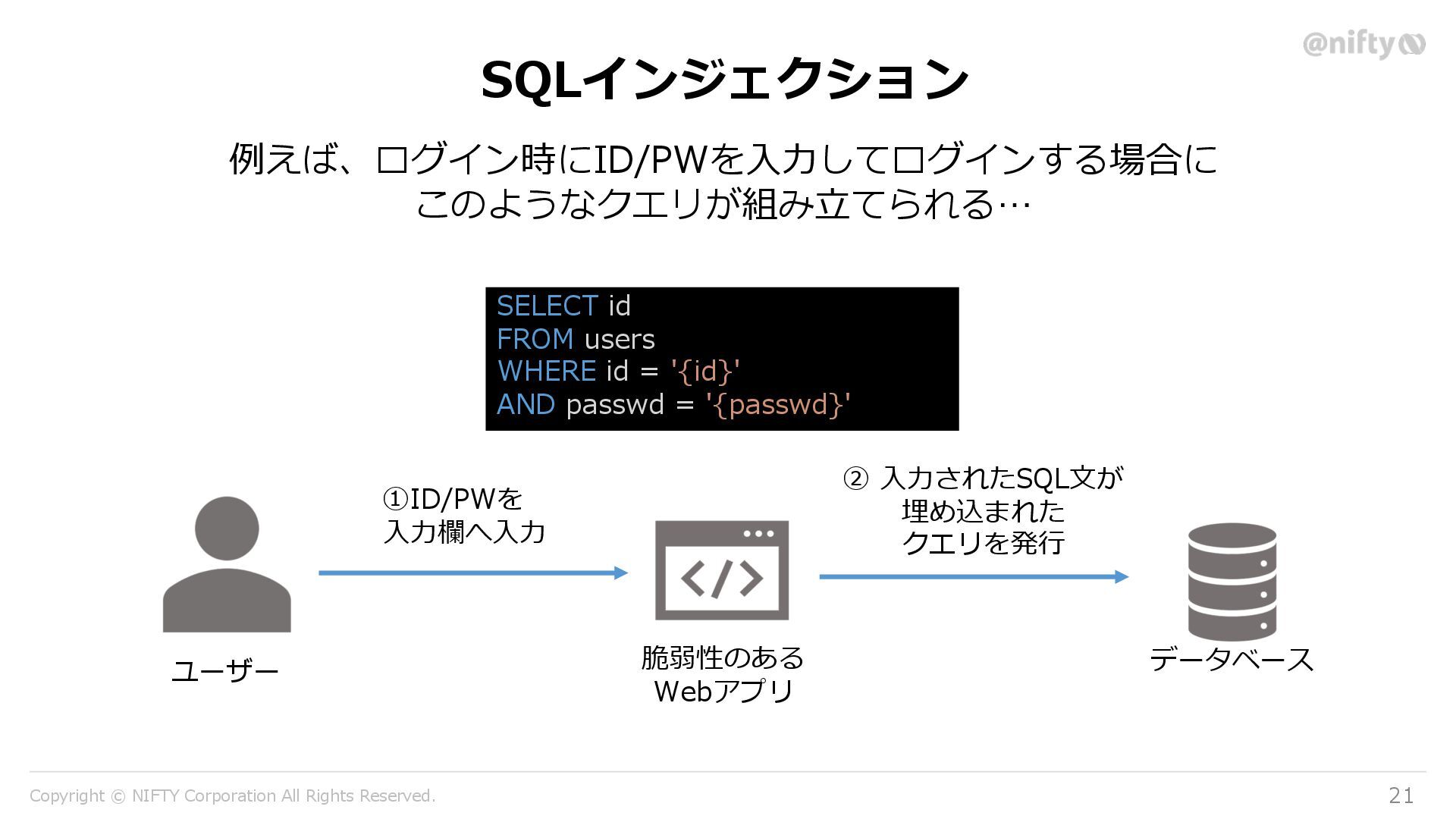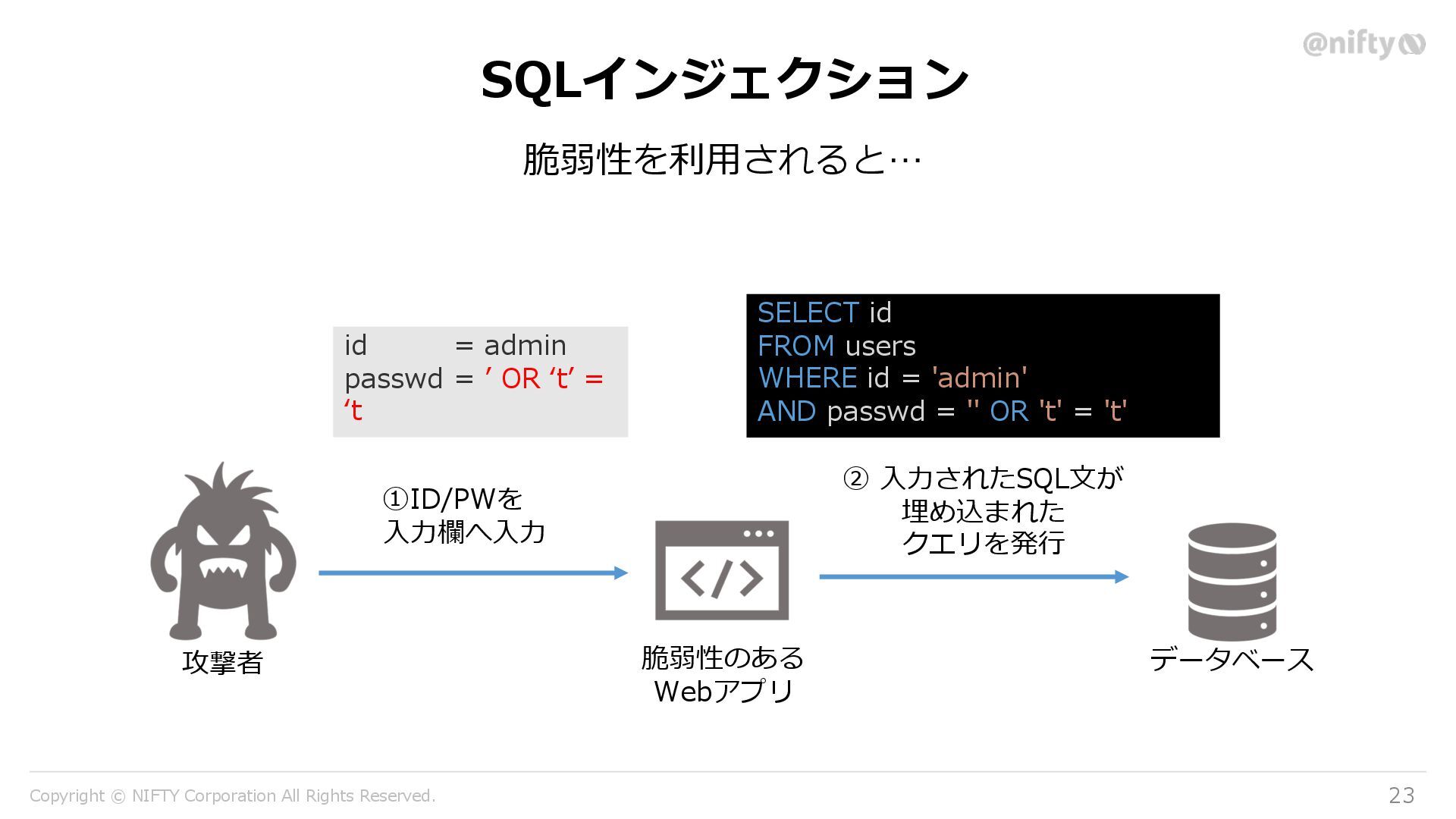⼊⼒欄へ⼊⼒ ② ⼊⼒されたSQL⽂が 埋め込まれた クエリを発⾏ 脆弱性のある Webアプリ データベース 攻撃者 SQLインジェクション id = admin passwd = ʼ OR ʻtʼ = ʻt SELECT id FROM users WHERE id = 'admin' AND passwd = '' OR 't' = 't'