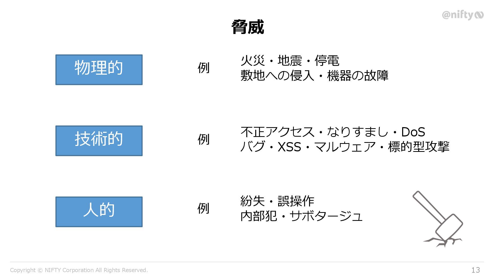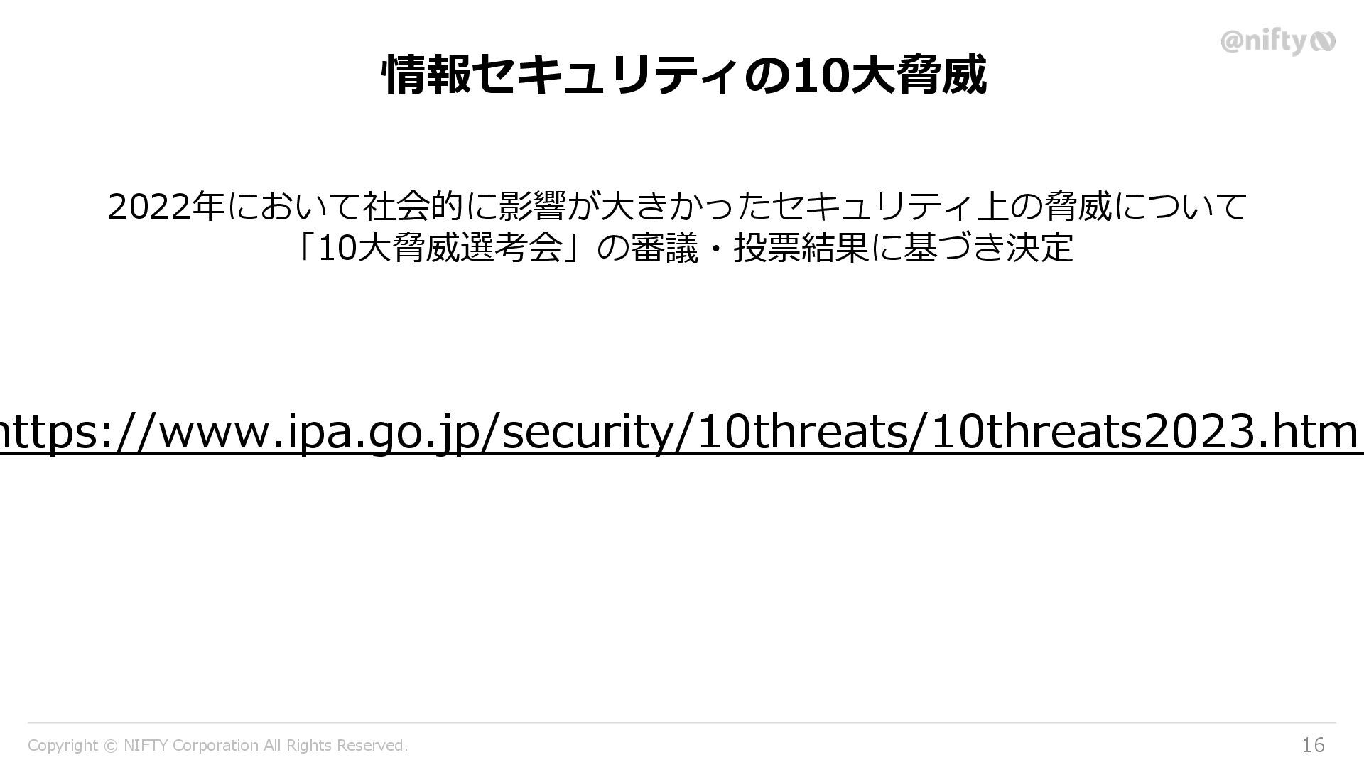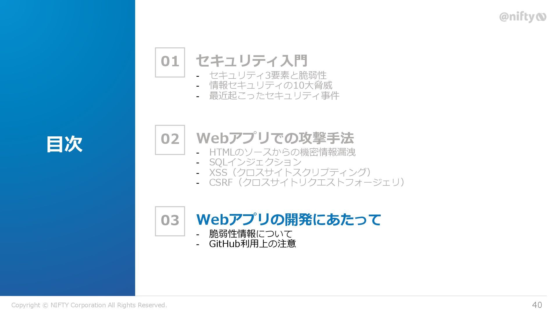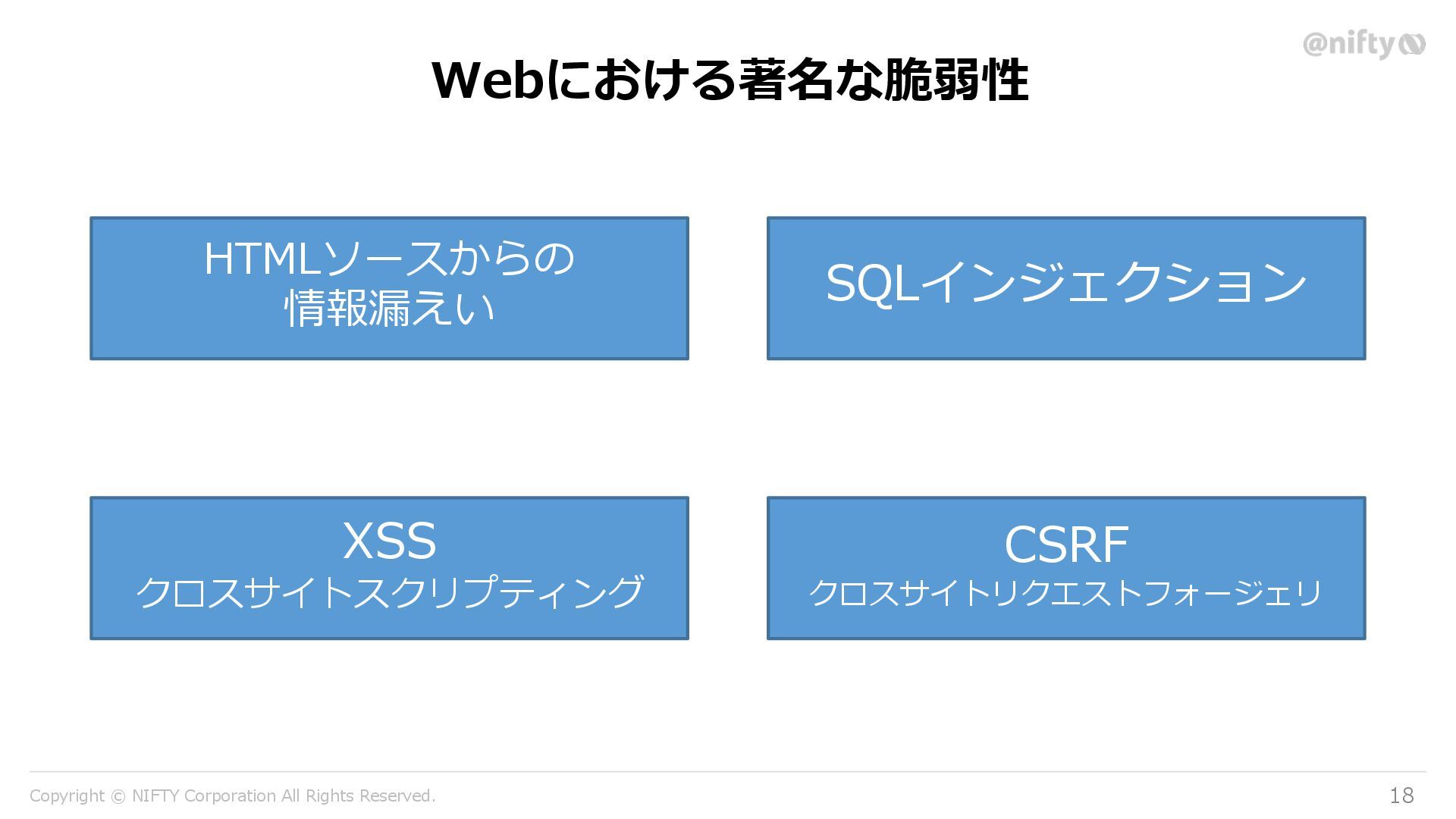 ⼊⼒欄へ⼊⼒ ② ⼊⼒されたSQL⽂が 埋め込まれた クエリを発⾏ 脆弱性のある Webアプリ データベース 攻撃者 SQLインジェクション id = admin passwd = ʼ OR ʻtʼ = ʻt SELECT id FROM users WHERE id = 'admin' AND passwd = '' OR 't' = 't'