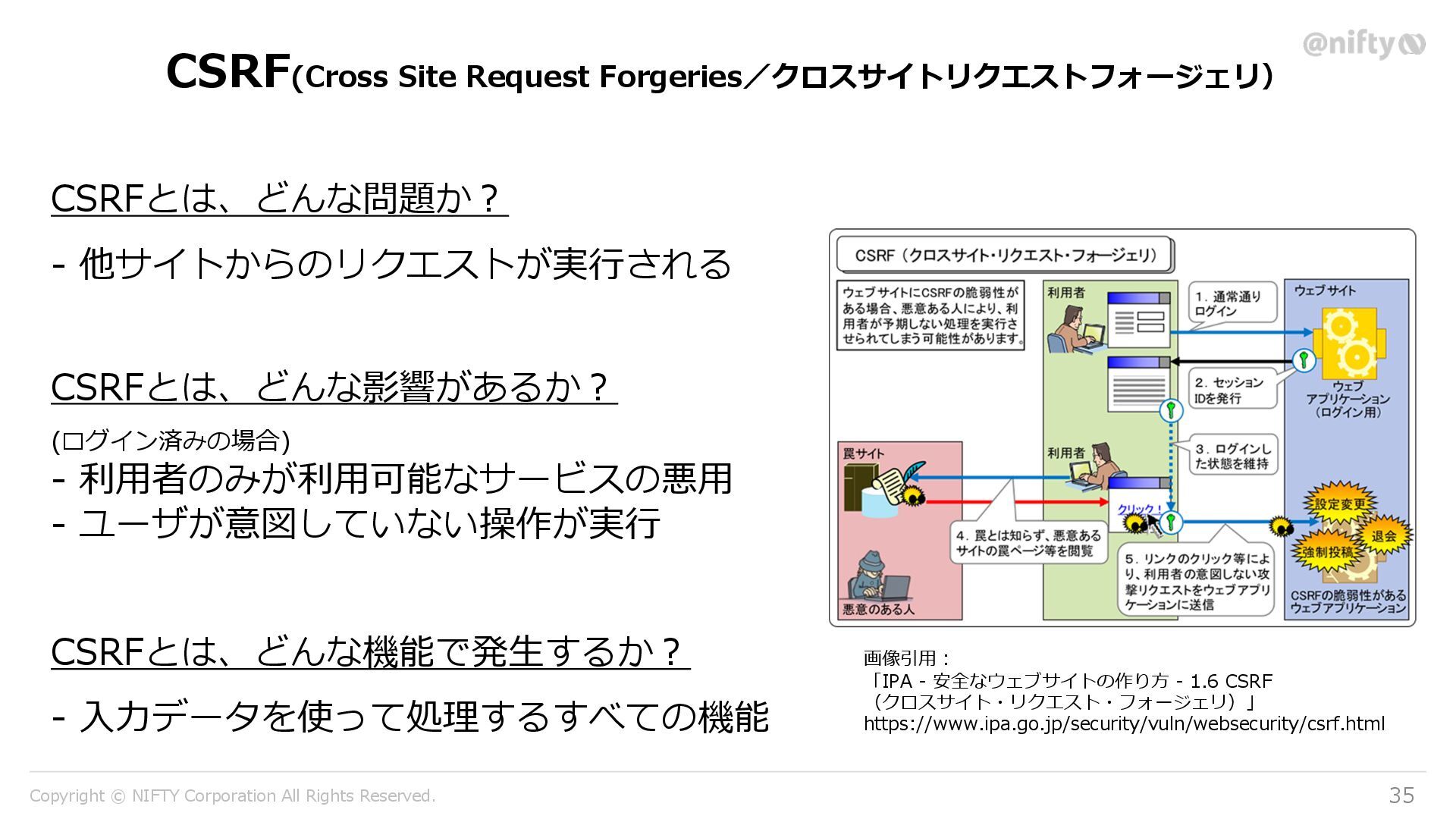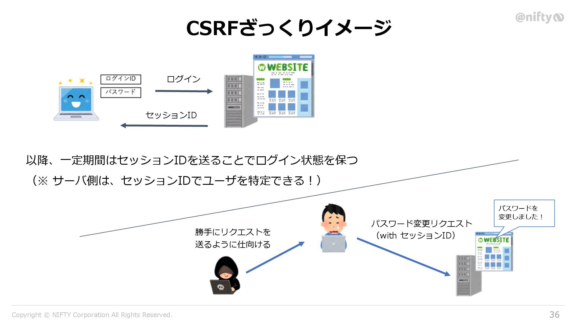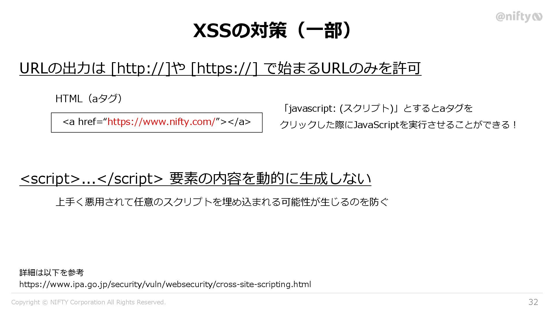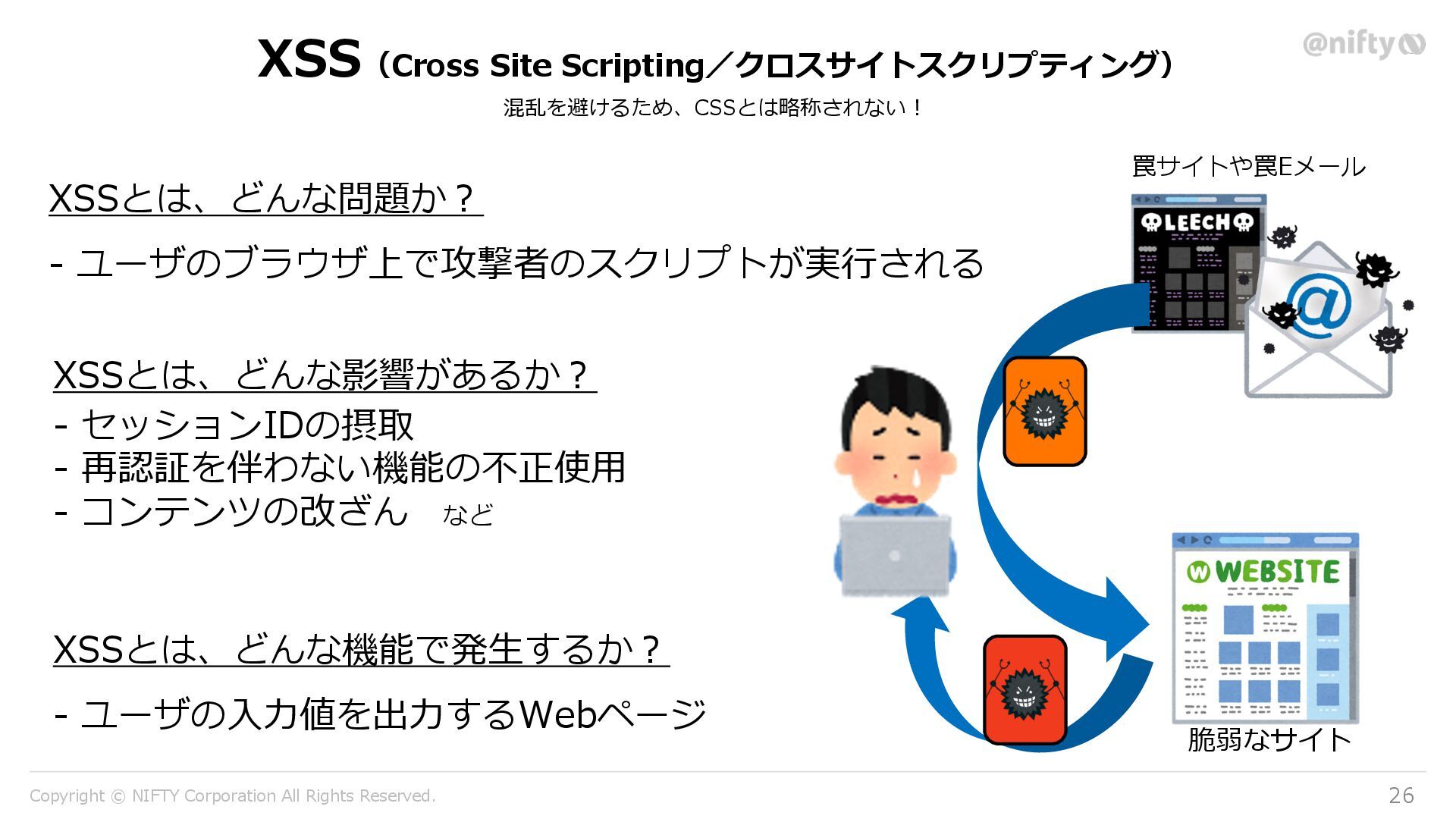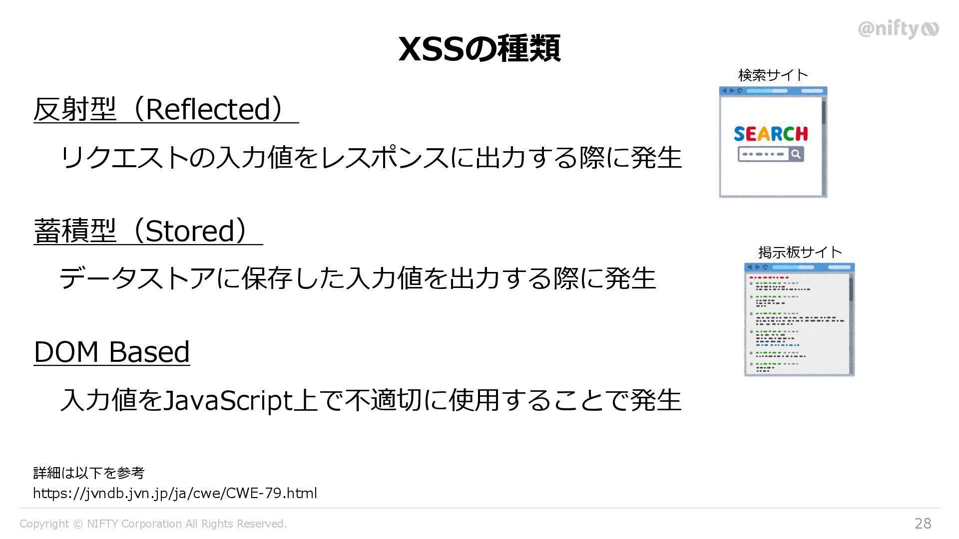 リクエストの⼊⼒値をレスポンスに出⼒する際に発⽣ 蓄積型(Stored) データストアに保存した⼊⼒値を出⼒する際に発⽣ DOM Based ⼊⼒値をJavaScript上で不適切に使⽤することで発⽣ 詳細は以下を参考 https://jvndb.jvn.jp/ja/cwe/CWE-79.html 検索サイト 掲⽰板サイト