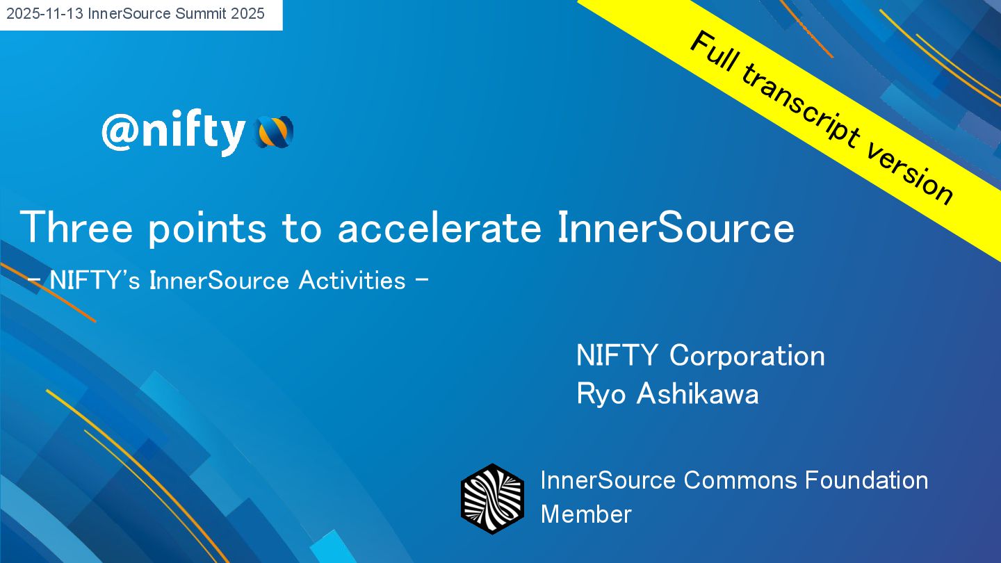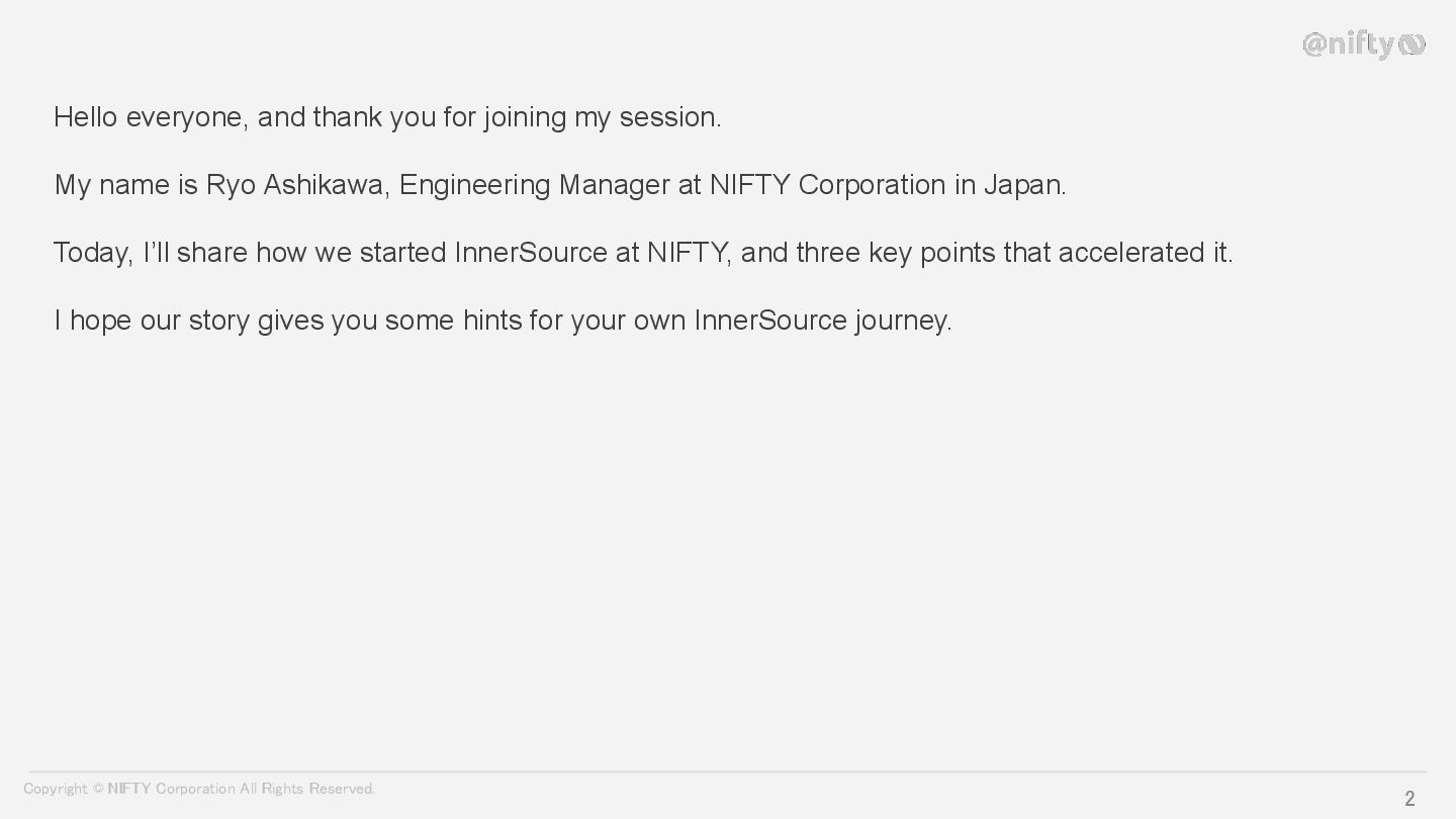everyone, and thank you for joining my session. My name is Ryo Ashikawa, Engineering Manager at NIFTY Corporation in Japan. Today, I’ll share how we started InnerSource at NIFTY, and three key points that accelerated it. I hope our story gives you some hints for your own InnerSource journey.