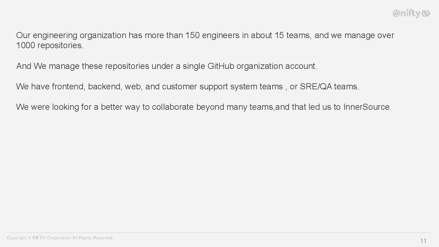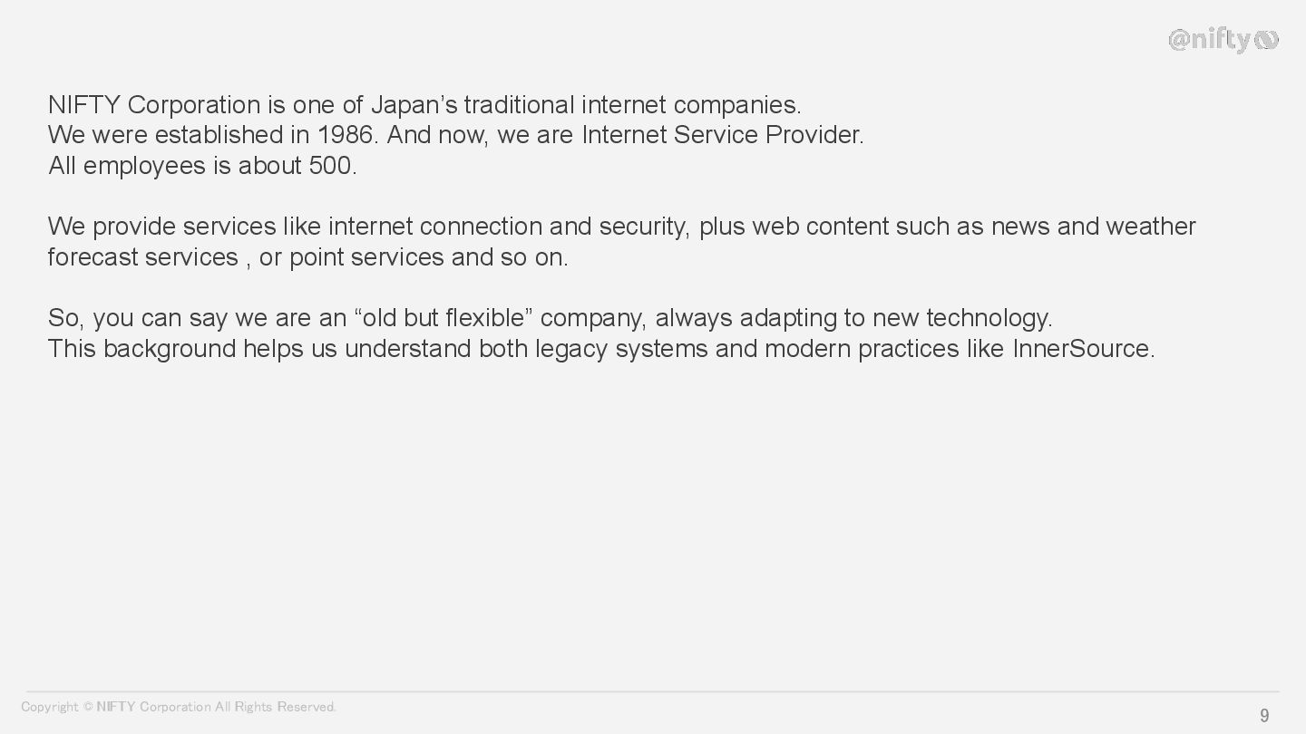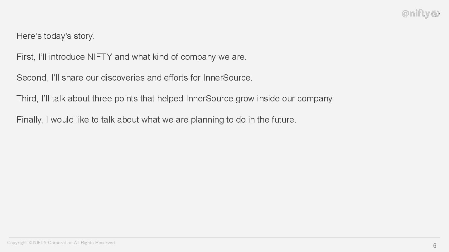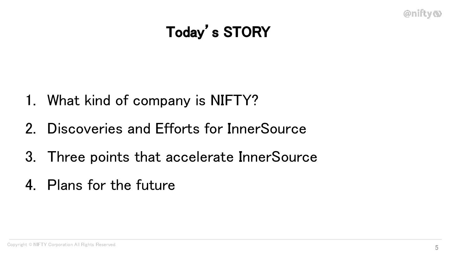 today’s story. First, I’ll introduce NIFTY and what kind of company we are. Second, I’ll share our discoveries and efforts for InnerSource. Third, I’ll talk about three points that helped InnerSource grow inside our company. Finally, I would like to talk about what we are planning to do in the future.