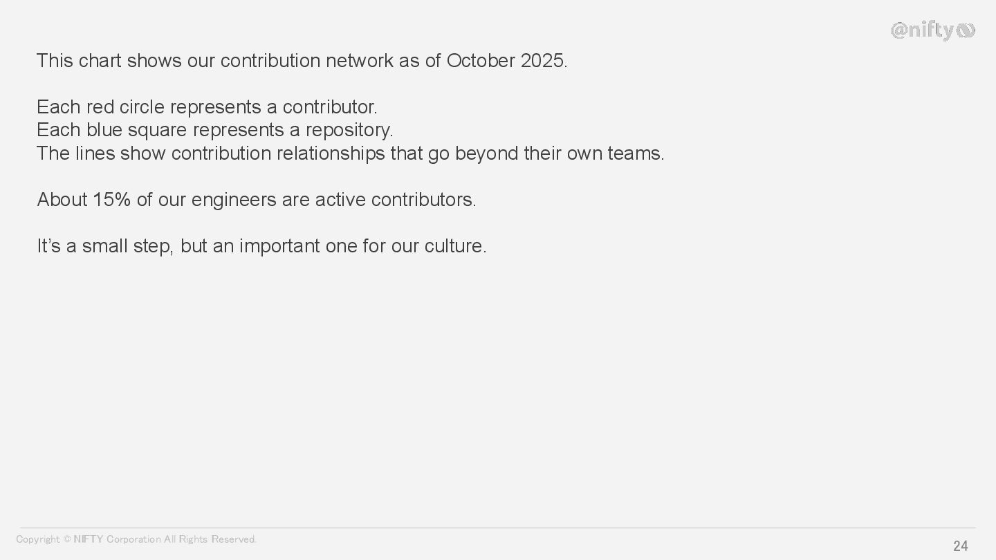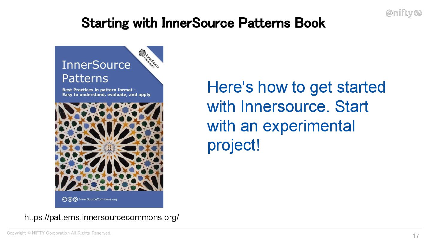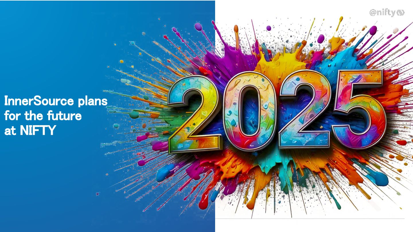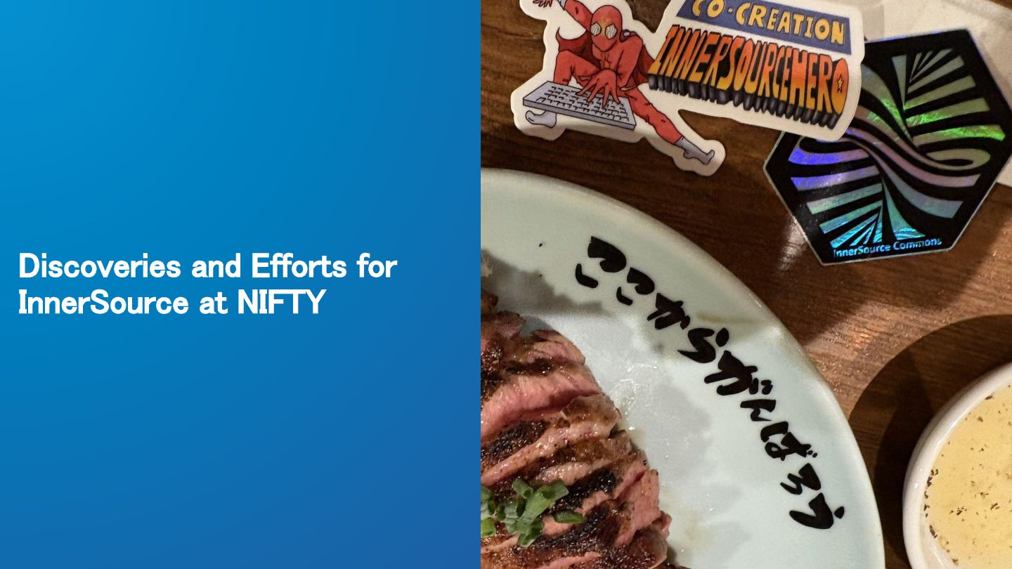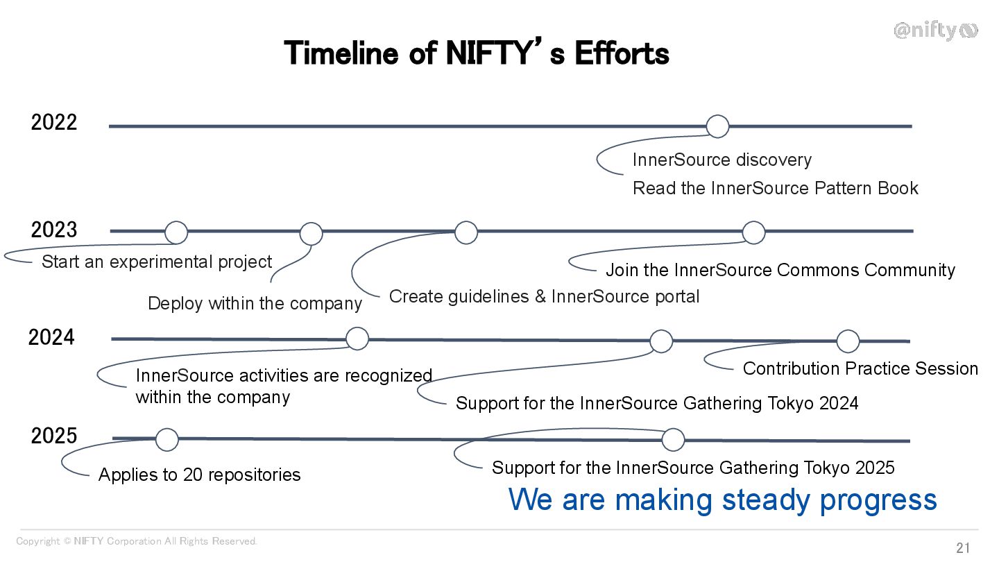 of NIFTY’s Efforts 2022 2023 2024 2025 InnerSource discovery Read the InnerSource Pattern Book Start an experimental project Deploy within the company Create guidelines & InnerSource portal Join the InnerSource Commons Community InnerSource activities are recognized within the company Support for the InnerSource Gathering Tokyo 2024 Contribution Practice Session Applies to 20 repositories We are making steady progress Support for the InnerSource Gathering Tokyo 2025