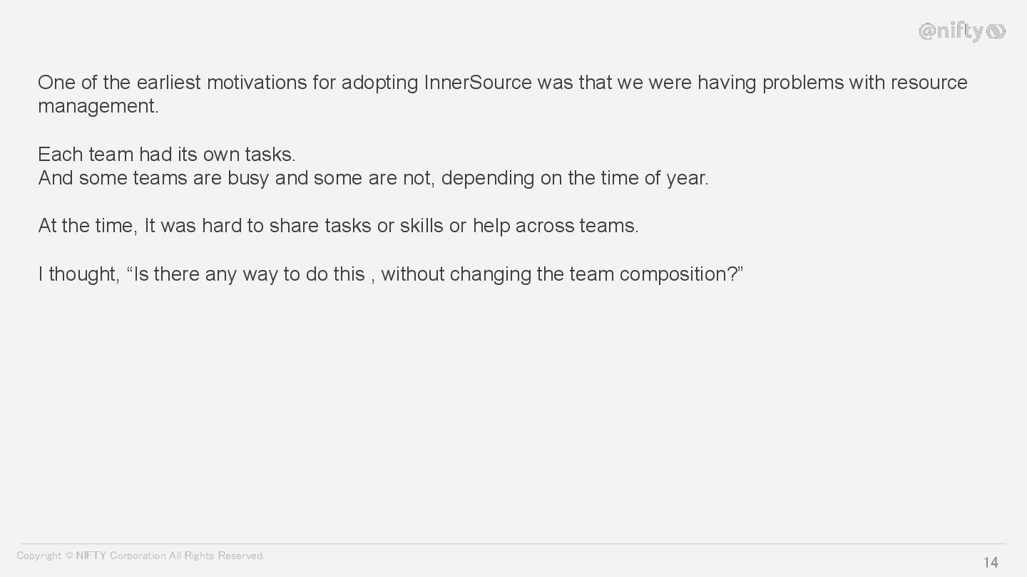 of the earliest motivations for adopting InnerSource was that we were having problems with resource management. Each team had its own tasks. And some teams are busy and some are not, depending on the time of year. At the time, It was hard to share tasks or skills or help across teams. I thought, “Is there any way to do this , without changing the team composition?”