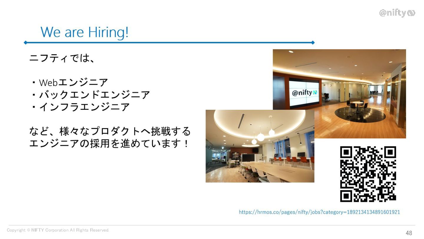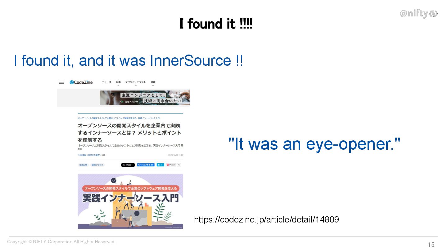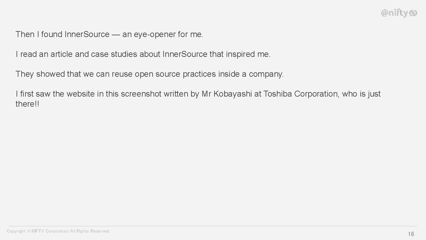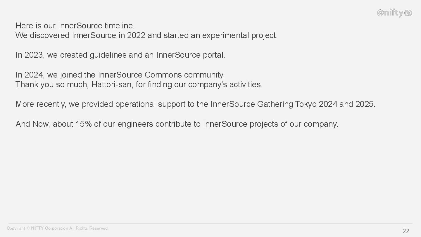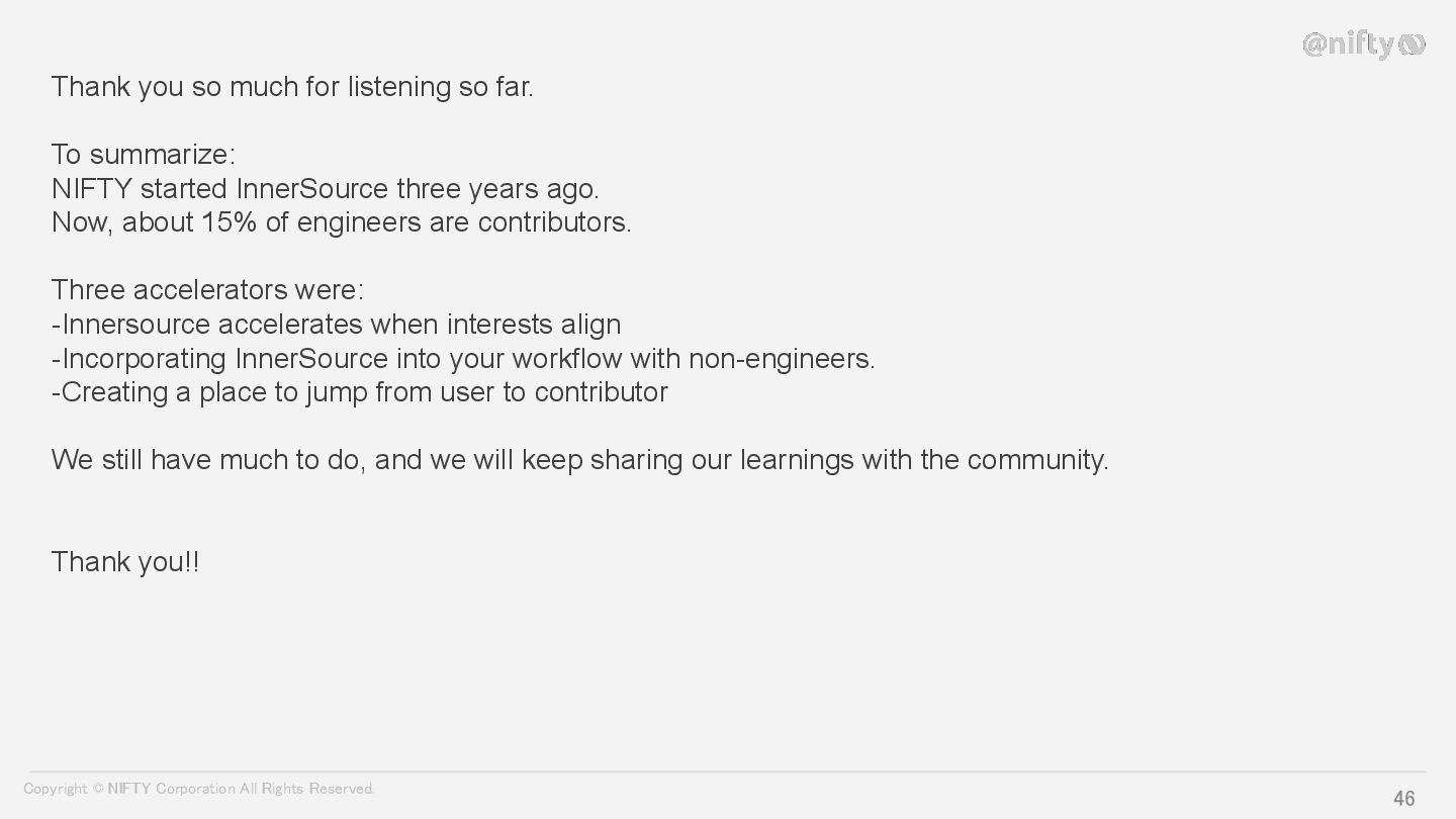 you so much for listening so far. To summarize: NIFTY started InnerSource three years ago. Now, about 15% of engineers are contributors. Three accelerators were: -Innersource accelerates when interests align -Incorporating InnerSource into your workflow with non-engineers. -Creating a place to jump from user to contributor We still have much to do, and we will keep sharing our learnings with the community. Thank you!!