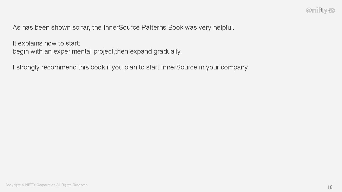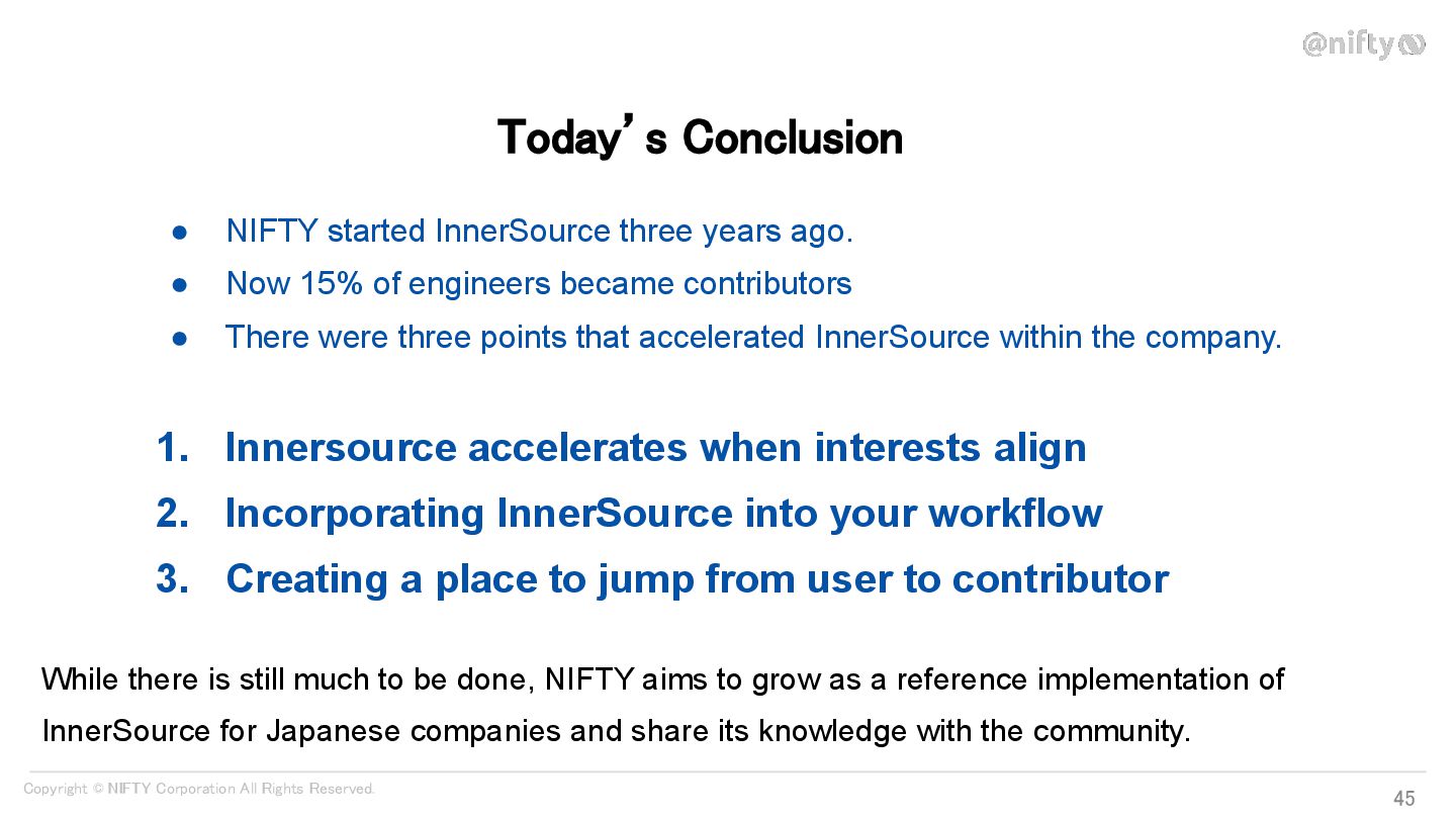 Conclusion • NIFTY started InnerSource three years ago. • Now 15% of engineers became contributors • There were three points that accelerated InnerSource within the company. 1. Innersource accelerates when interests align 2. Incorporating InnerSource into your workflow 3. Creating a place to jump from user to contributor Knowledge While there is still much to be done, NIFTY aims to grow as a reference implementation of InnerSource for Japanese companies and share its knowledge with the community.