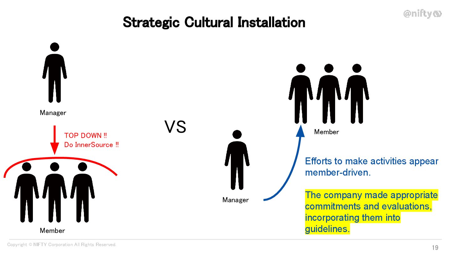 Strategic Cultural Installation Manager TOP DOWN !! Do InnerSource !! Member Manager Efforts to make activities appear member-driven. The company made appropriate commitments and evaluations, incorporating them into guidelines. VS