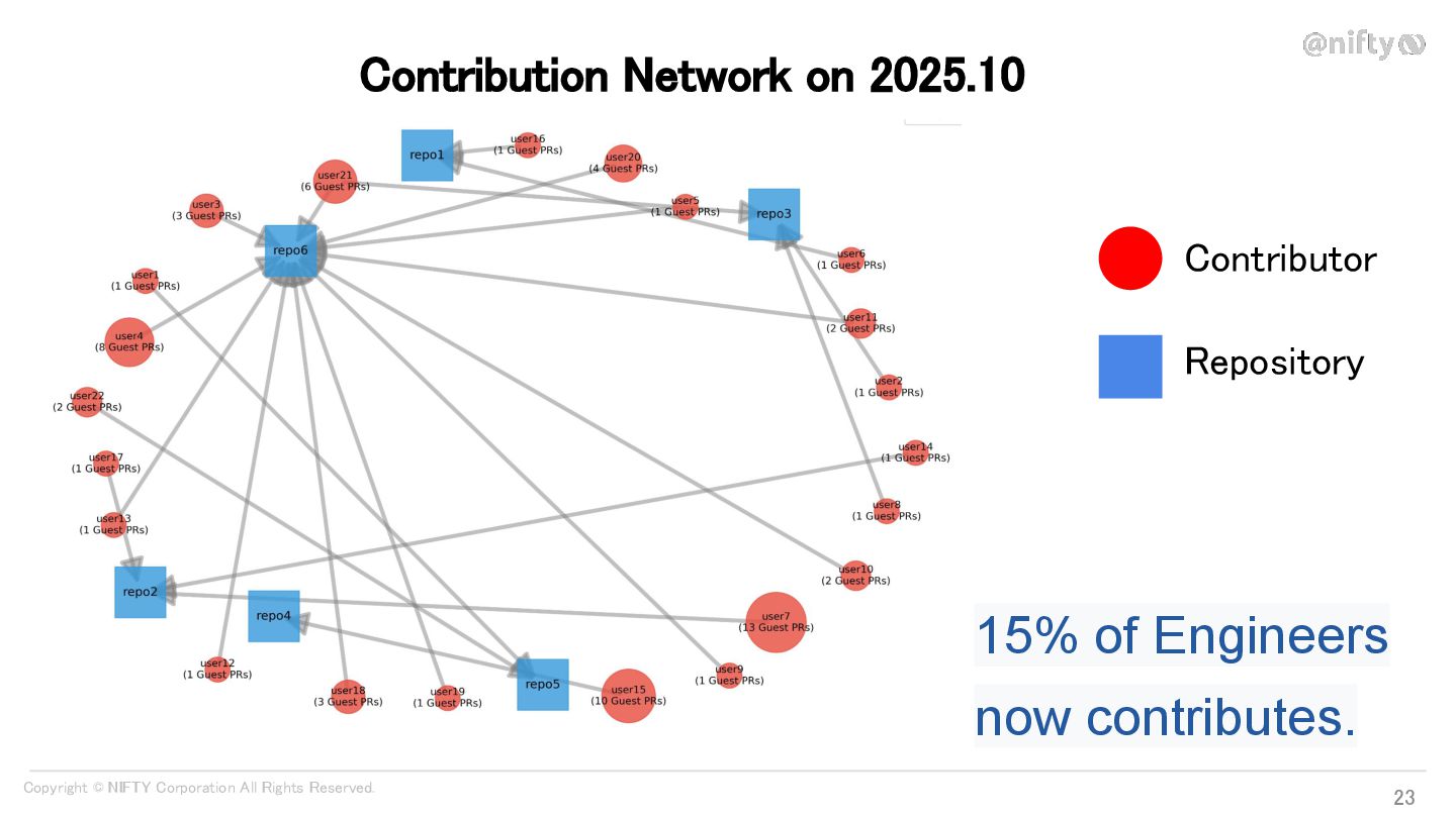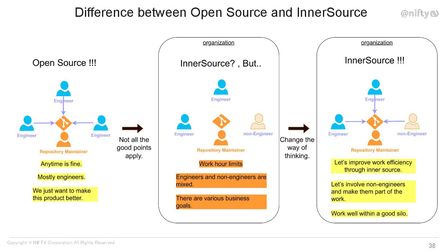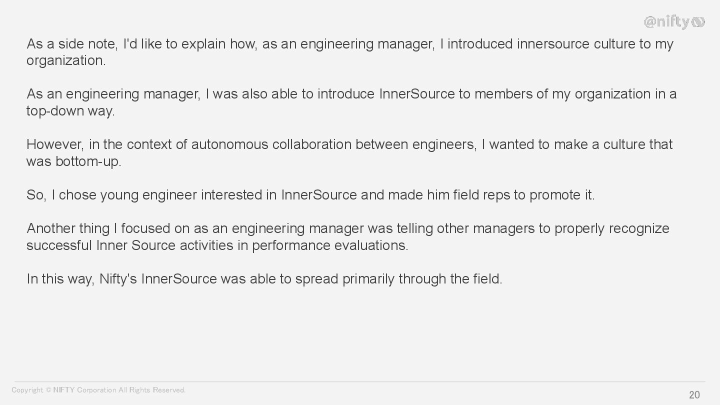 a side note, I'd like to explain how, as an engineering manager, I introduced innersource culture to my organization. As an engineering manager, I was also able to introduce InnerSource to members of my organization in a top-down way. However, in the context of autonomous collaboration between engineers, I wanted to make a culture that was bottom-up. So, I chose young engineer interested in InnerSource and made him field reps to promote it. Another thing I focused on as an engineering manager was telling other managers to properly recognize successful Inner Source activities in performance evaluations. In this way, Nifty's InnerSource was able to spread primarily through the field.