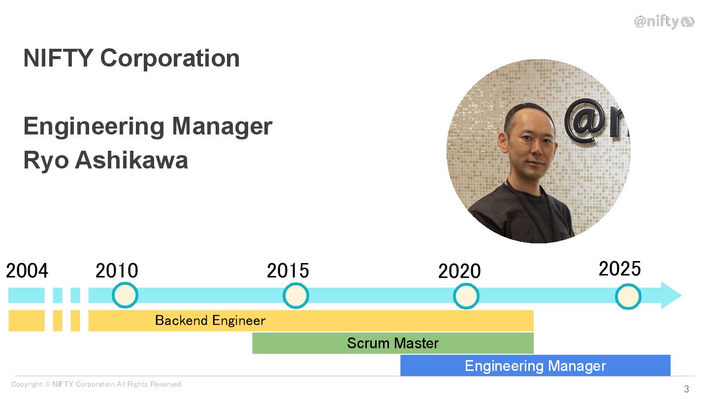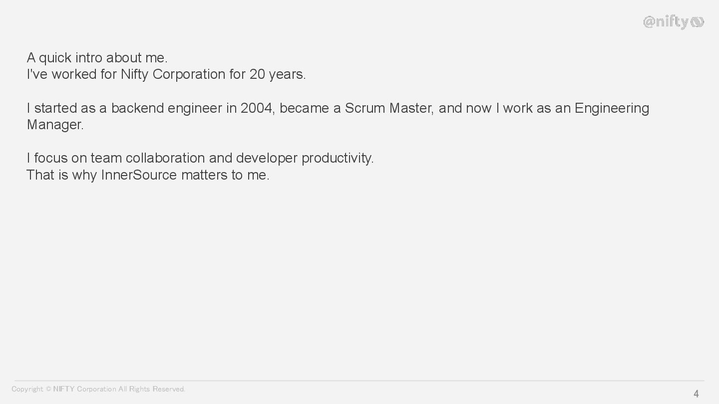 quick intro about me. I've worked for Nifty Corporation for 20 years. I started as a backend engineer in 2004, became a Scrum Master, and now I work as an Engineering Manager. I focus on team collaboration and developer productivity. That is why InnerSource matters to me.