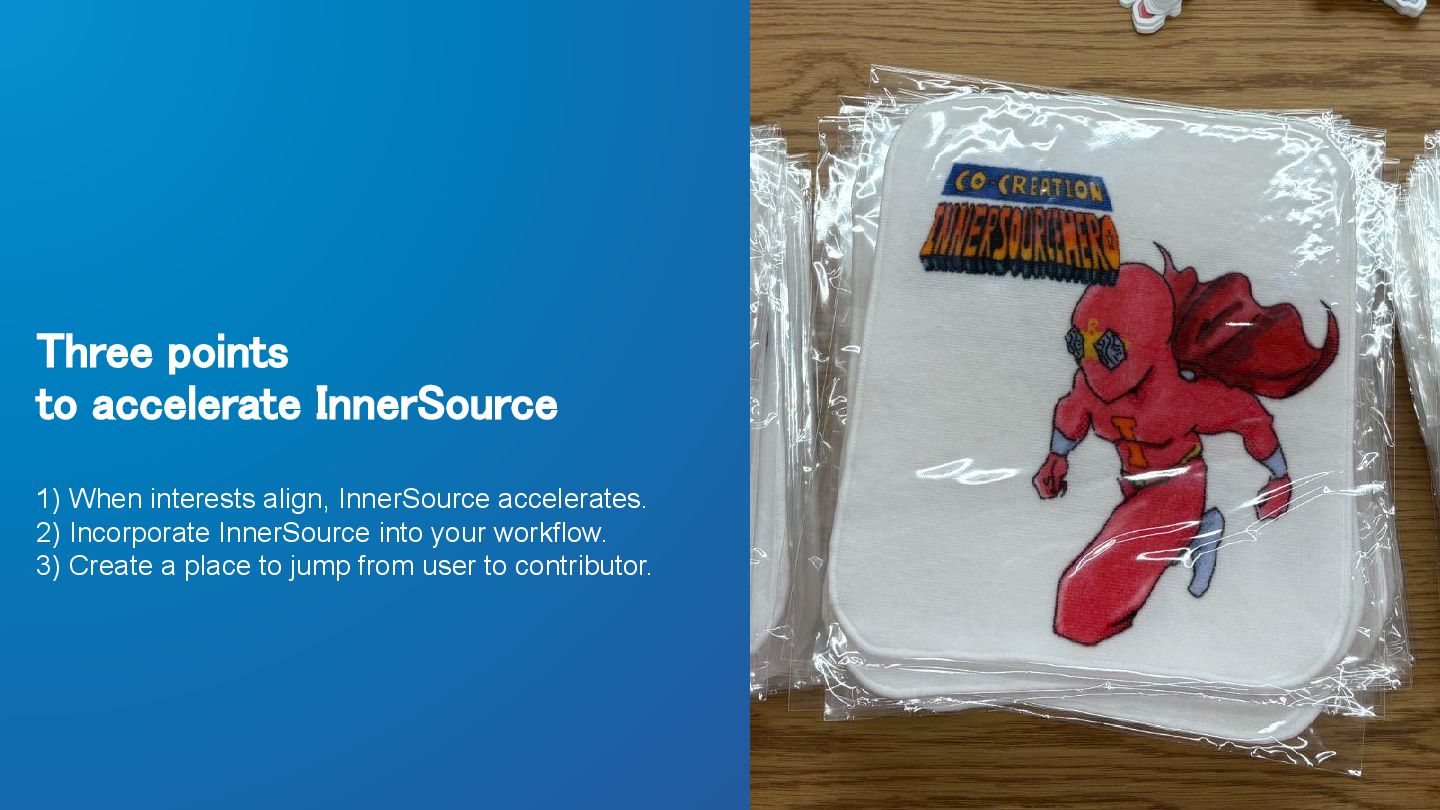 to accelerate InnerSource 1) When interests align, InnerSource accelerates. 2) Incorporate InnerSource into your workflow. 3) Create a place to jump from user to contributor.