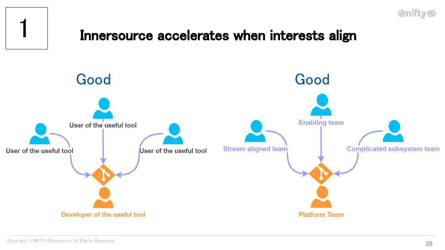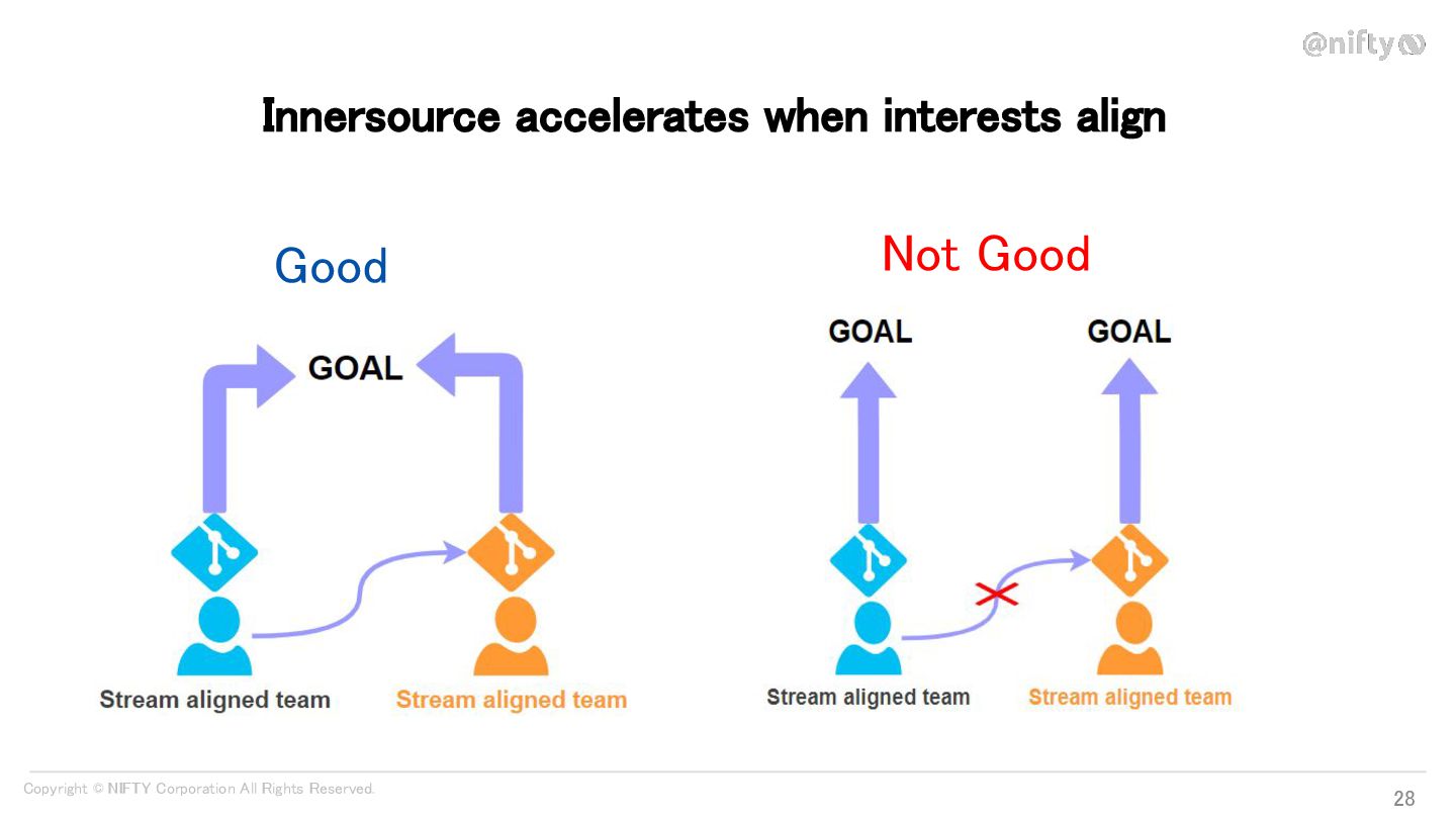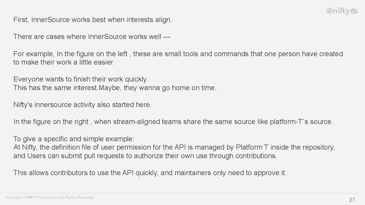 InnerSource works best when interests align. There are cases where InnerSource works well — For example, In the figure on the left , these are small tools and commands that one person have created to make their work a little easier. Everyone wants to finish their work quickly. This has the same interest.Maybe, they wanna go home on time. Nifty's innersource activity also started here. In the figure on the right , when stream-aligned teams share the same source like platform-T`s source. To give a specific and simple example: At Nifty, the definition file of user permission for the API is managed by Platform T inside the repository, and Users can submit pull requests to authorize their own use through contributions. This allows contributors to use the API quickly, and maintainers only need to approve it.