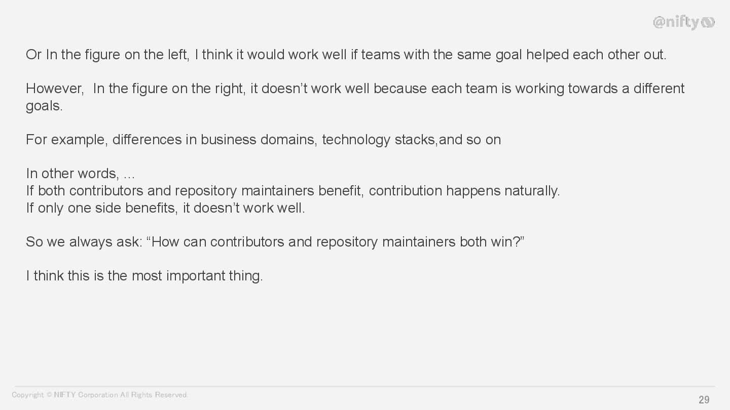 In the figure on the left, I think it would work well if teams with the same goal helped each other out. However, In the figure on the right, it doesn’t work well because each team is working towards a different goals. For example, differences in business domains, technology stacks,and so on In other words, ... If both contributors and repository maintainers benefit, contribution happens naturally. If only one side benefits, it doesn’t work well. So we always ask: “How can contributors and repository maintainers both win?” I think this is the most important thing.