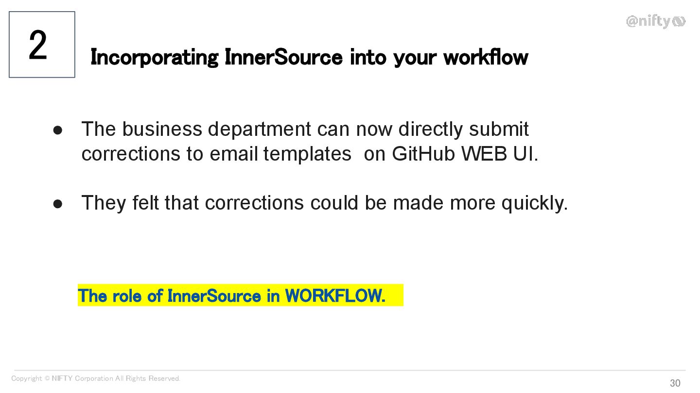 InnerSource into your workflow • The business department can now directly submit corrections to email templates on GitHub WEB UI. • They felt that corrections could be made more quickly. The role of InnerSource in WORKFLOW. Knowledge 2
