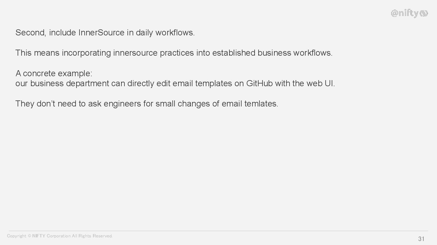 include InnerSource in daily workflows. This means incorporating innersource practices into established business workflows. A concrete example: our business department can directly edit email templates on GitHub with the web UI. They don’t need to ask engineers for small changes of email temlates.
