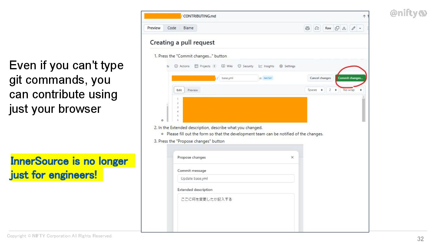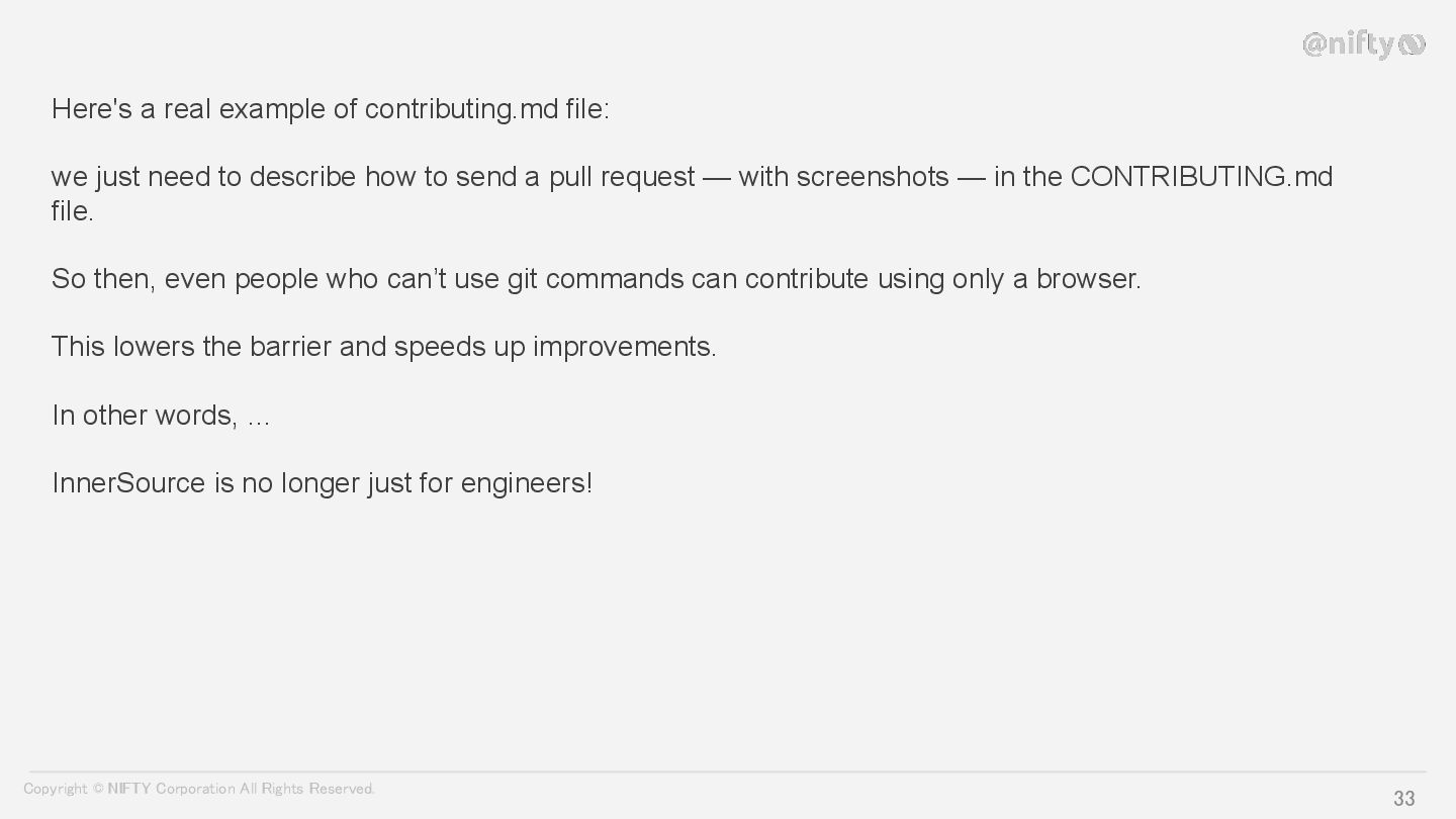 a real example of contributing.md file: we just need to describe how to send a pull request — with screenshots — in the CONTRIBUTING.md file. So then, even people who can’t use git commands can contribute using only a browser. This lowers the barrier and speeds up improvements. In other words, … InnerSource is no longer just for engineers!