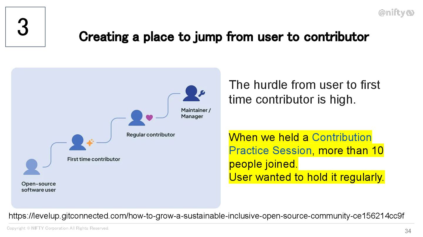 a place to jump from user to contributor https://levelup.gitconnected.com/how-to-grow-a-sustainable-inclusive-open-source-community-ce156214cc9f The hurdle from user to first time contributor is high. When we held a Contribution Practice Session, more than 10 people joined. User wanted to hold it regularly. Knowledge 3