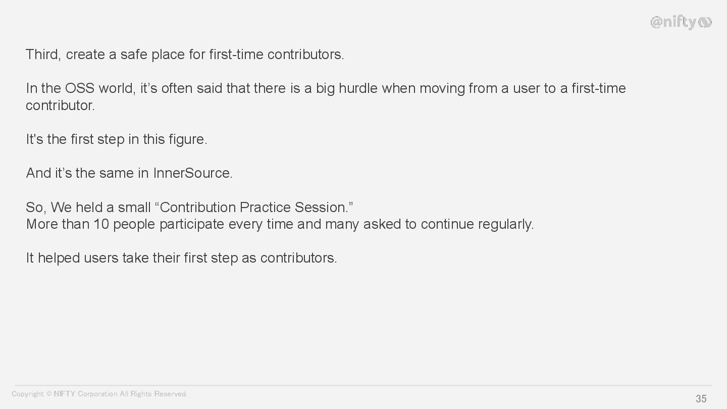 create a safe place for first-time contributors. In the OSS world, it’s often said that there is a big hurdle when moving from a user to a first-time contributor. It's the first step in this figure. And it’s the same in InnerSource. So, We held a small “Contribution Practice Session.” More than 10 people participate every time and many asked to continue regularly. It helped users take their first step as contributors.