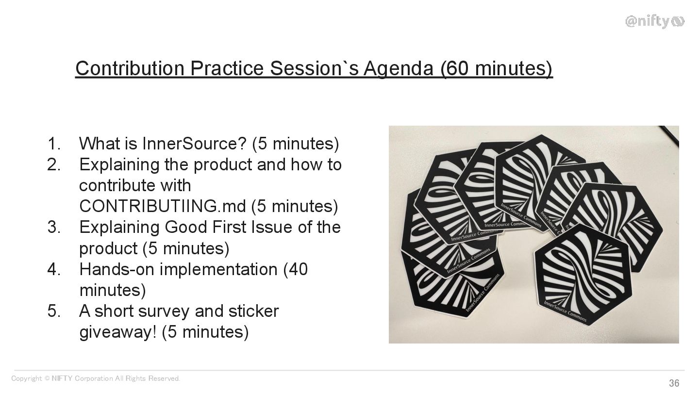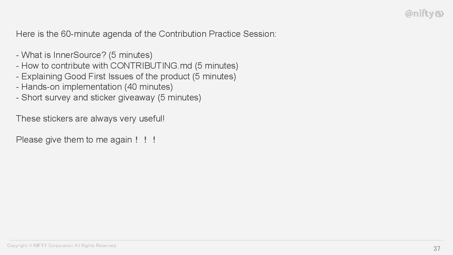 is the 60-minute agenda of the Contribution Practice Session: - What is InnerSource? (5 minutes) - How to contribute with CONTRIBUTING.md (5 minutes) - Explaining Good First Issues of the product (5 minutes) - Hands-on implementation (40 minutes) - Short survey and sticker giveaway (5 minutes) These stickers are always very useful! Please give them to me again!!!
