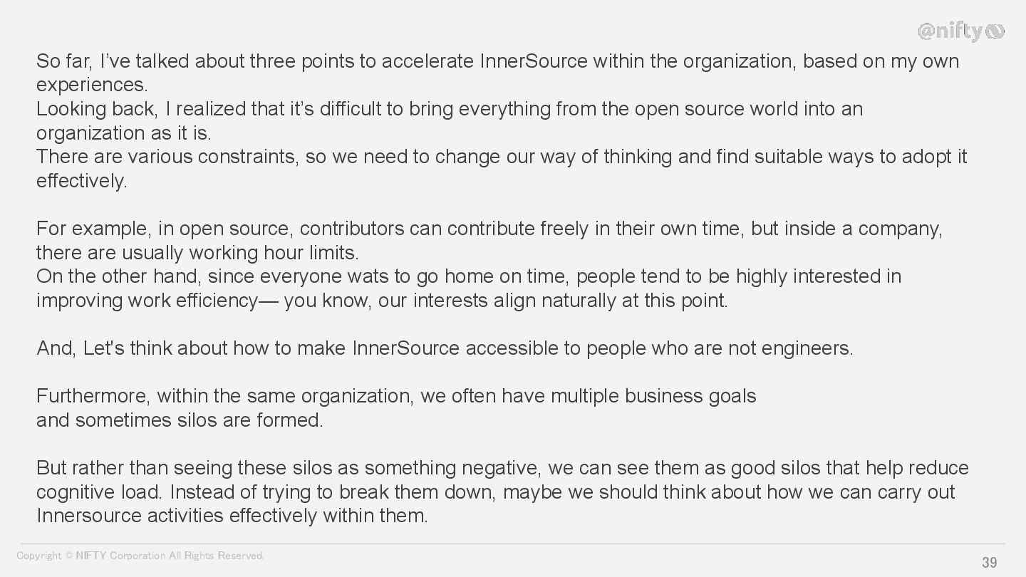 far, I’ve talked about three points to accelerate InnerSource within the organization, based on my own experiences. Looking back, I realized that it’s difficult to bring everything from the open source world into an organization as it is. There are various constraints, so we need to change our way of thinking and find suitable ways to adopt it effectively. For example, in open source, contributors can contribute freely in their own time, but inside a company, there are usually working hour limits. On the other hand, since everyone wats to go home on time, people tend to be highly interested in improving work efficiency— you know, our interests align naturally at this point. And, Let's think about how to make InnerSource accessible to people who are not engineers. Furthermore, within the same organization, we often have multiple business goals and sometimes silos are formed. But rather than seeing these silos as something negative, we can see them as good silos that help reduce cognitive load. Instead of trying to break them down, maybe we should think about how we can carry out Innersource activities effectively within them.